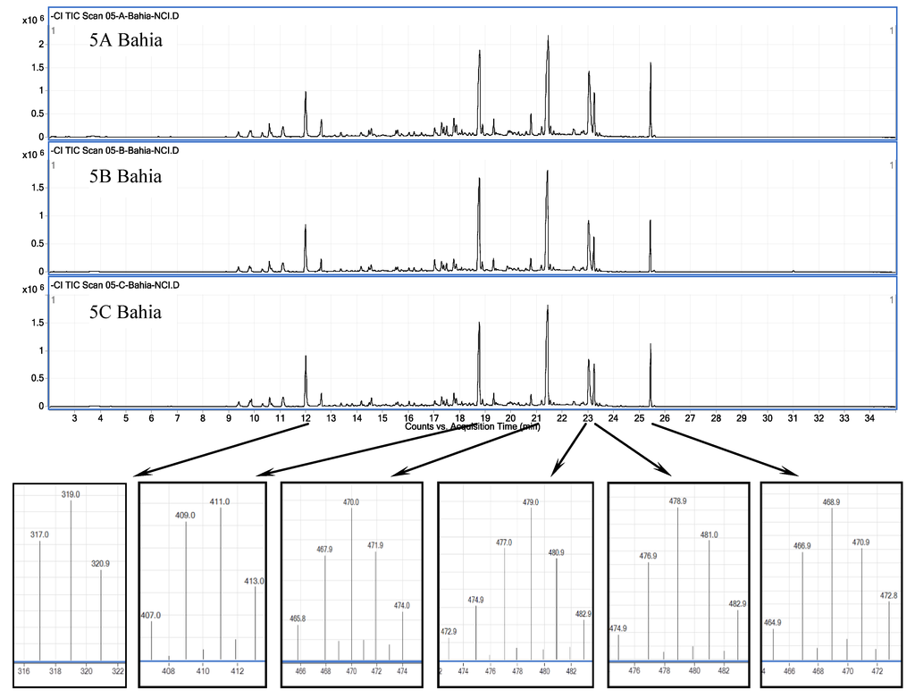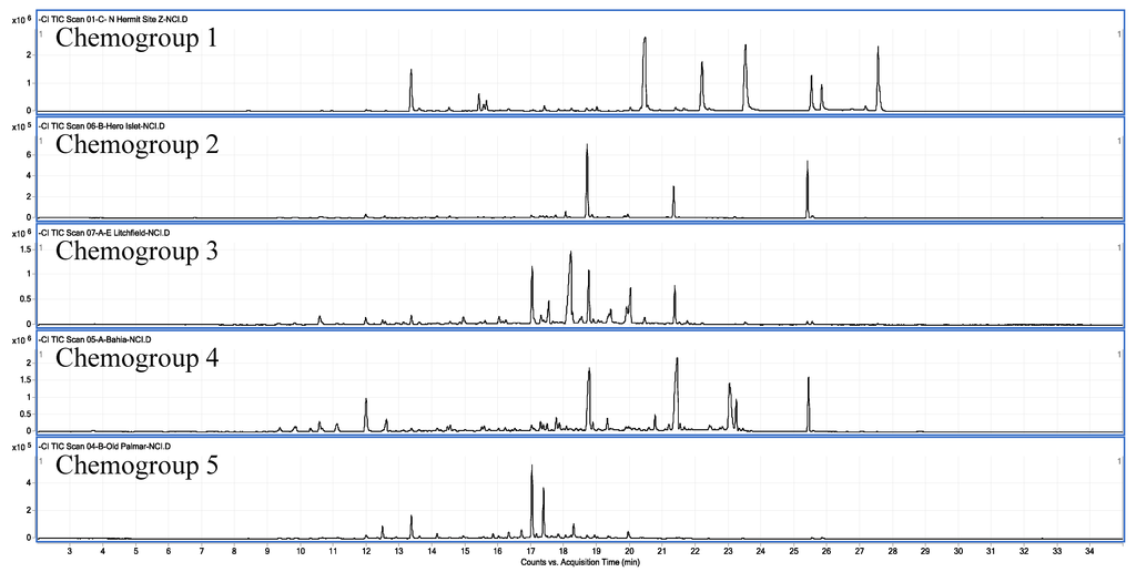 Relative intensities of the chromatographic features observed in Figure 4, as well as minor features present in the chromatograms, track consistently among the three plants, identifying the individual plants as expressing the same secondary metabolome. Figure 5 compares one member from all five chemogroups. Notice that only one, chemogroup 2, shares more than one major feature with chemogroup 4’s major features (18.6, 21.4 and 25.4 min), although the relative intensities differ between shared features of chemogroup 2 and 4. In addition, two, chemogroups 1 and 5, share no major features with chemogroup 4. Figure 5 then displays the secondary metabolome that characterize chemogroups identified in this study. Further identification of metabolites is not possible at this time, due to a lack of standards for comparison. However, isotopic distribution patterns like those described for chemogroup 4 clearly identify the metabolites in this study as polyhalogenated secondary metabolites.