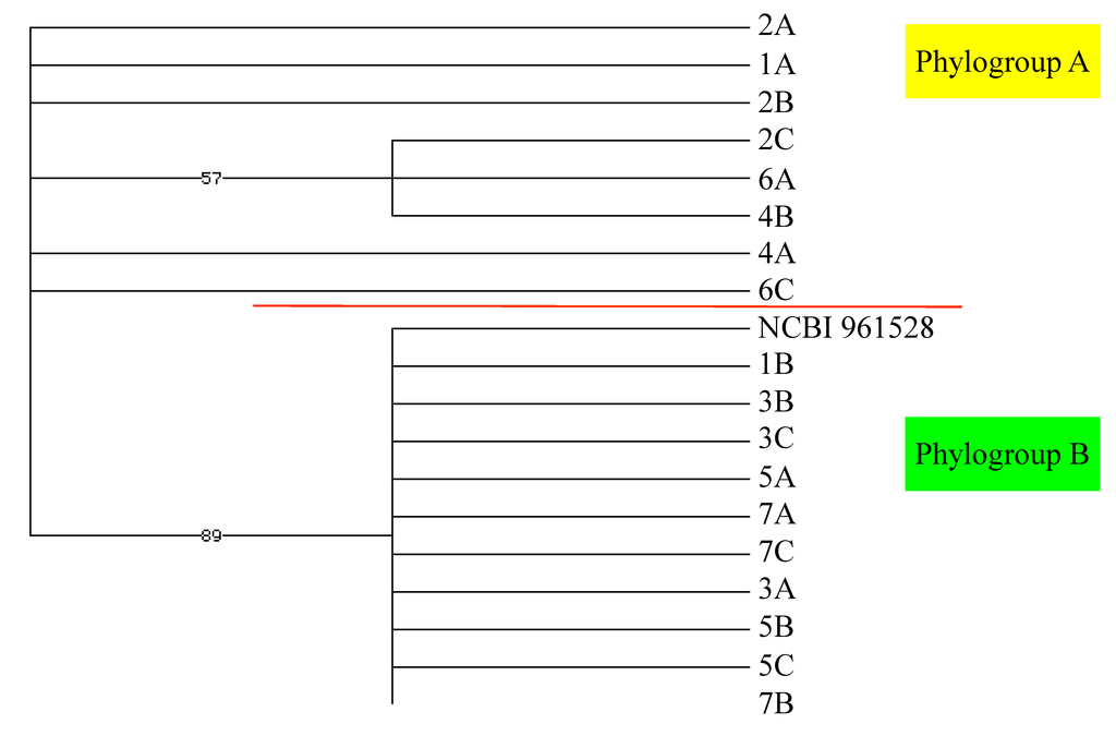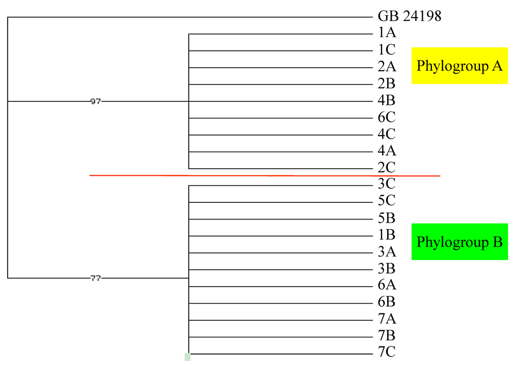 Although there was morphological variation within our 21 individual algal specimens, there were no clear morphological groupings. However, based on the known cryptic diversity within P. cartilagineum, we chose to sequence the rbcL and cox1 genes to examine genetic diversity within our collection []. The cox1 genes from our algal samples diverged into two clades (Figure 6), designated phylogroups A and B, with nine and eleven members, respectively. The rbcL analysis (Figure 7) found the same members in phylogroup B, with the exception of one alga, designated Hero Inlet sample A (6A), which clustered with phylogroup A. The rbcL gene of phylogroup A was distinct from that of phylogroup B, although five of the eight members claded independently (Figure 7). The divergence between genotypes is 2.1% or less for cox1 (Figure S1) and 1.1% or less for rbcL (Figure S2). Based on these small sequence differences, the specimens represented in the dataset strongly reflect conspecificity. These values are in agreement with previous reports on percent differences among individuals of the same species for red algae using cox1 and rbcL [,,]. However, the observed divergence could represent an early stage of cryptic speciation.