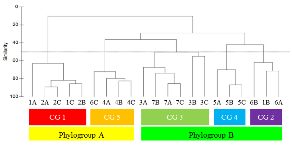 Bray-Curtis similarity dendrogram showing the relationship of the metabolomic profiles between algal collection sites (labeled by site number (1–7) and sample replicate (A–C)). Algae clustering with greater than 50% similarity (dotted line) were assigned as chemogroups 1–5 (CG 1–5). Chemogroups further separated into the two phylogroups A and B.