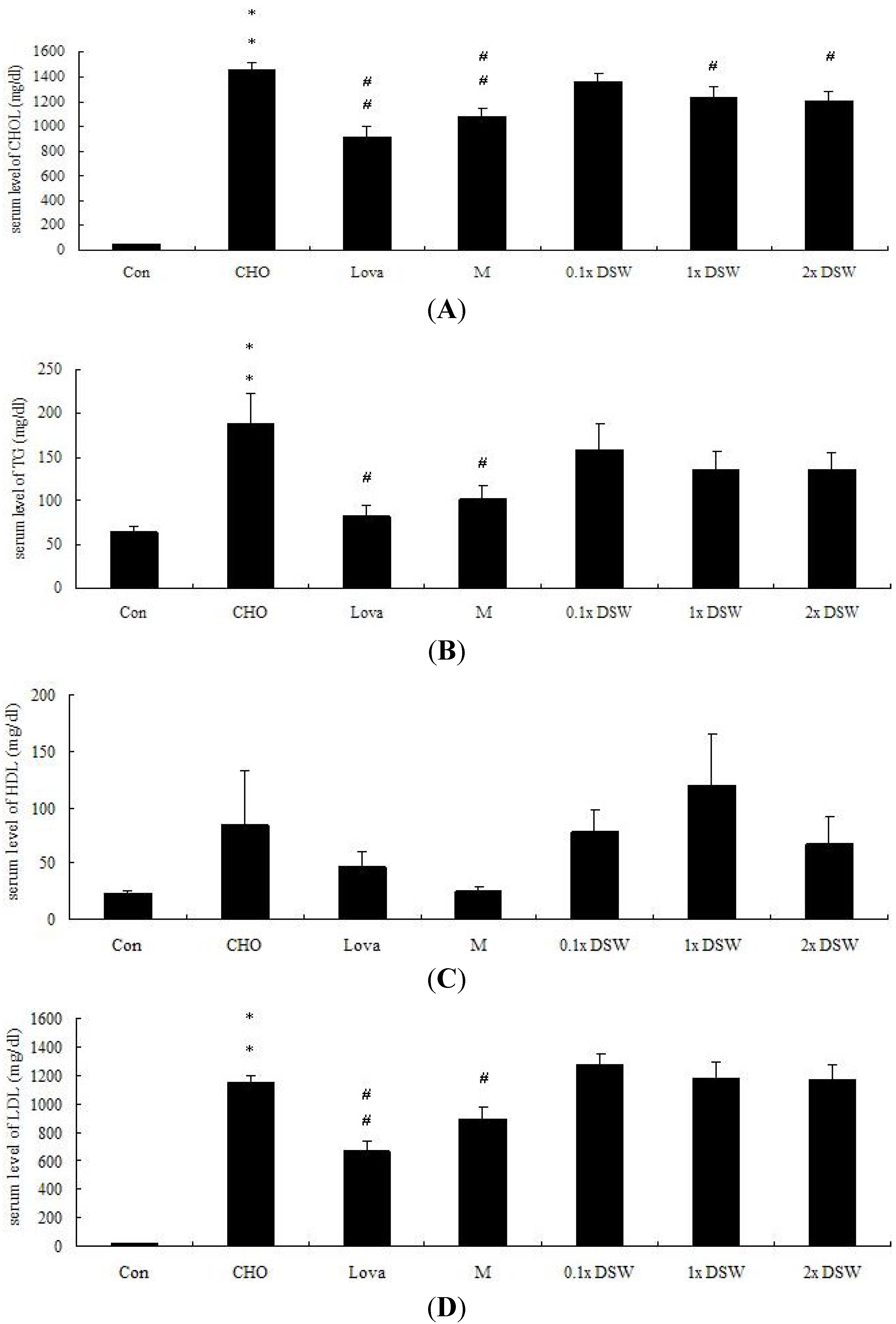 The serum chemical parameters were examined to assess whether DSW could reduce the serum lipid profiles. Our results indicated that the plasma TC, triglyceride (TG), and LDL-C levels were improved after eight weeks of a 0.5% cholesterol diet (Figure 1a–c). In total, 1 × DSW, and 2 × DSW significantly improved the TC level by 1.18-, and 1.21-fold, respectively. The results have been consistent with findings in other studies [28,29], and the results were similar to the effects in the MgCl2 and lovastatin groups (Figure 1a).