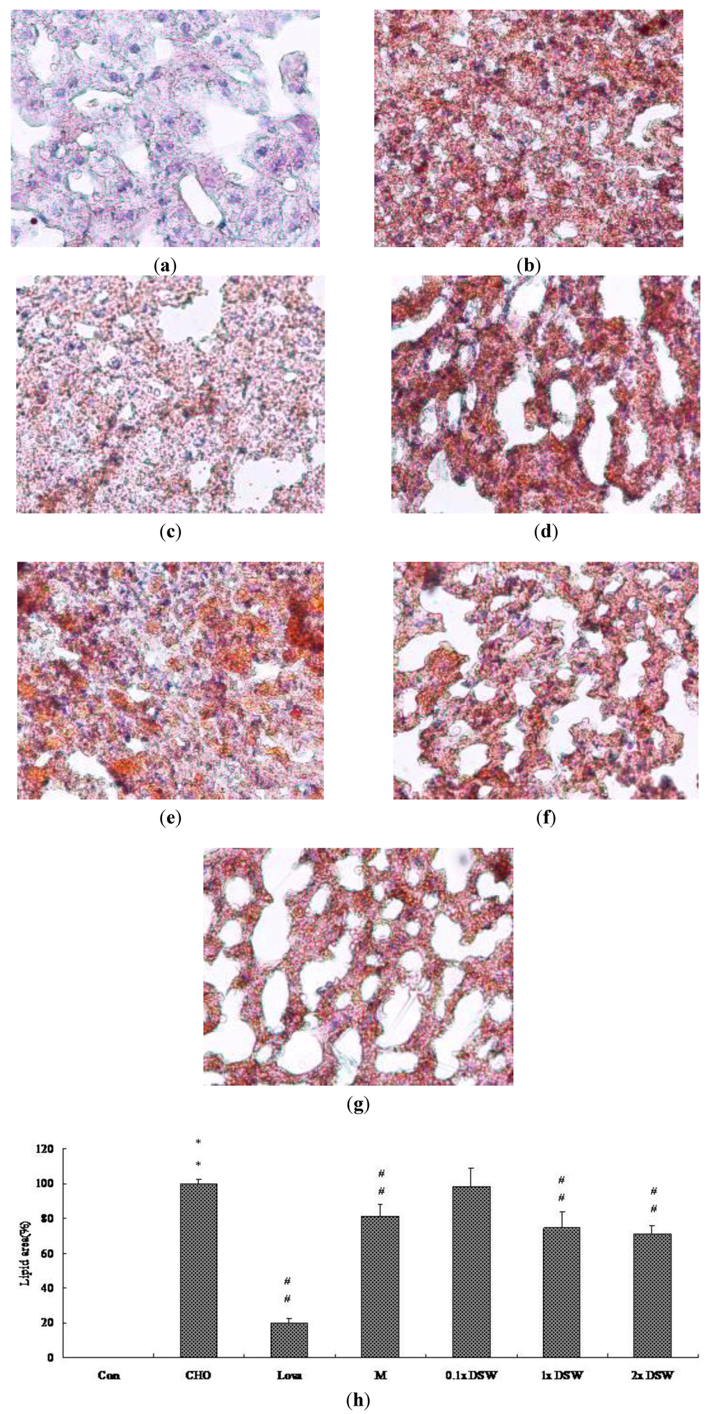 Histopathochemical examination of liver tissues in the hypercholesterolemic rabbit model after the eight-week study. (a) Control group (Con); (b) 0.5% cholesterol diet (CHO); (c) 0.5% cholesterol diet with 0.01% lovastatin (Lova); (d) 0.5% cholesterol diet with a 10% MgCl2 (M); (e) 0.5% cholesterol diet with 0.1 × DSW (0.1 × DSW); (f) 0.5% cholesterol diet with 1 × DSW (1 × DSW); (g) 0.5% cholesterol diet with 2 × DSW (2 × DSW); (h) densitometric analyses of (a–g). ** p < 0.01 compared to the control group; ## p < 0.01 compared to the cholesterol group.