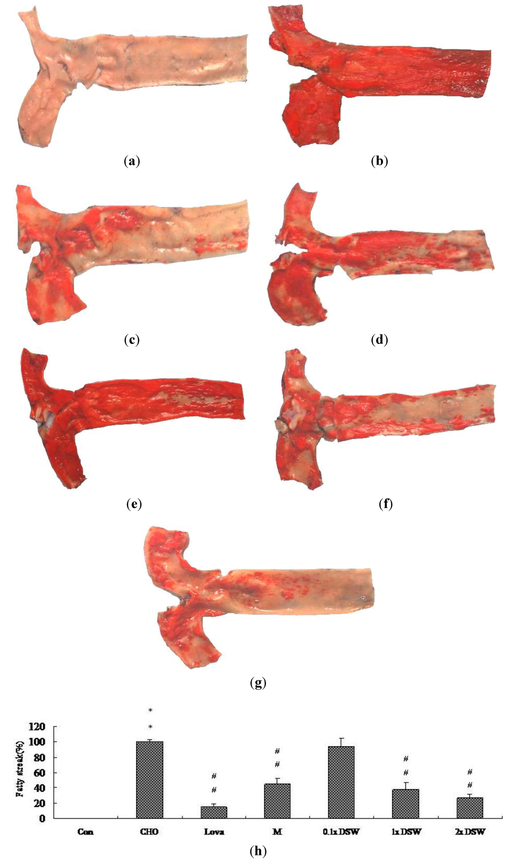 Histopathochemical examination of aortic fatty streak lesions in the hypercholesterolemic rabbit model after the eight-week study. (a) Control group (Con); (b) 0.5% cholesterol diet (CHO); (c) 0.5% cholesterol diet with 0.01% lovastatin (Lova); (d) 0.5% cholesterol diet with a 10% MgCl2 (M); (e) 0.5% cholesterol diet with 0.1 × DSW (0.1 × DSW); (f) 0.5% cholesterol diet with 1 × DSW (1 × DSW); (g) 0.5% cholesterol diet with 2 × DSW (2 × DSW); (h) densitometric analyses of (a–g). ** p < 0.01 compared to the control group; ## p < 0.01 compared to the cholesterol group.