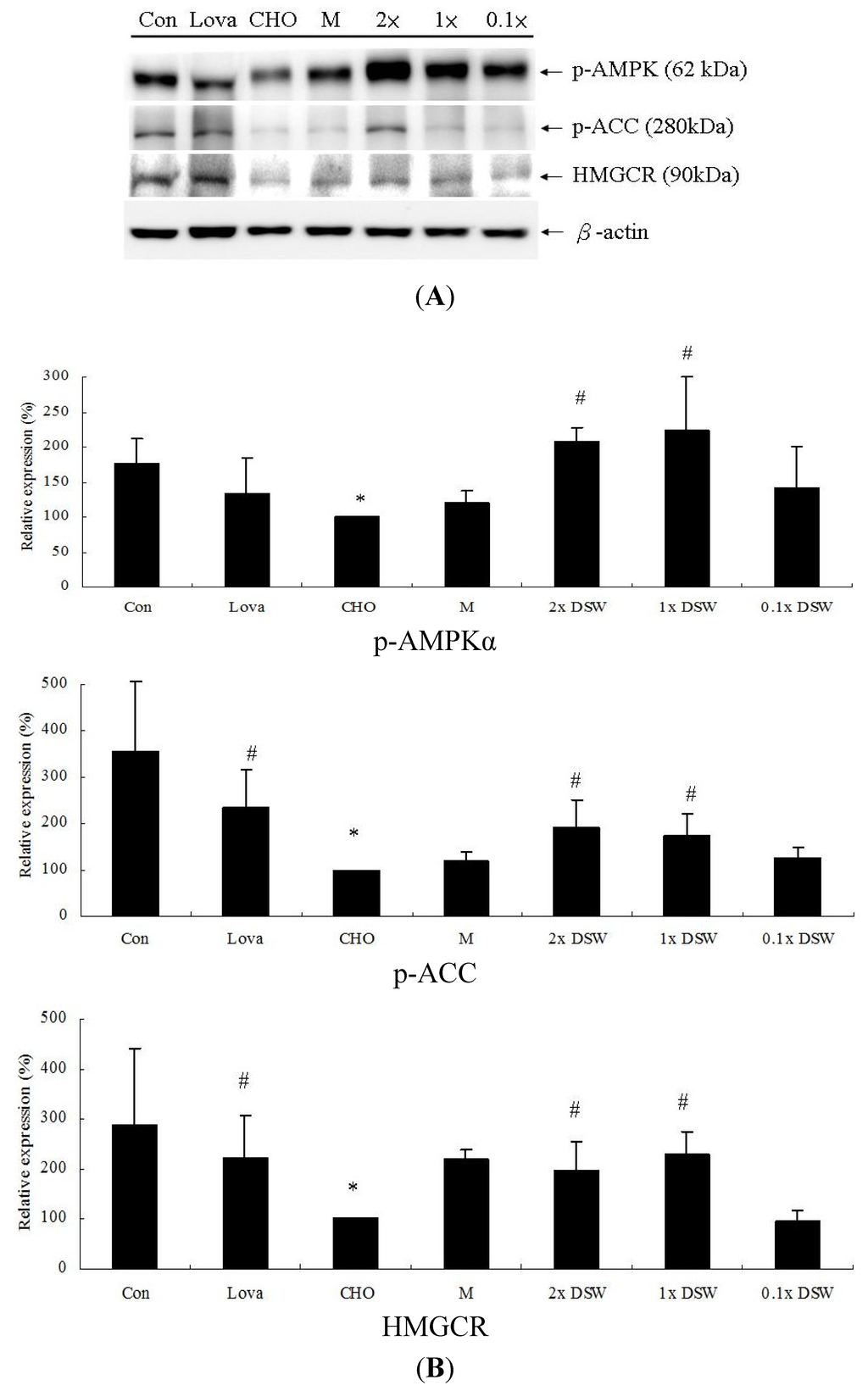 To determine how DSW affects the lipid-lowering effects, we investigated lipid metabolism-associated proteins, such as AMPK, ACC, and HMGCR. Our results demonstrated that the protein expression of AMPK phosphorylation, ACC phosphorylation, and HMGCR were significantly decreased after an eight-week treatment with the 0.5% (w/w) cholesterol diet (Figure 5). The addition of 1 × DSW and 2 × DSW returned the expression of these proteins to near basal levels compared to the cholesterol group, which showed a similar result as in the lovastatin group.