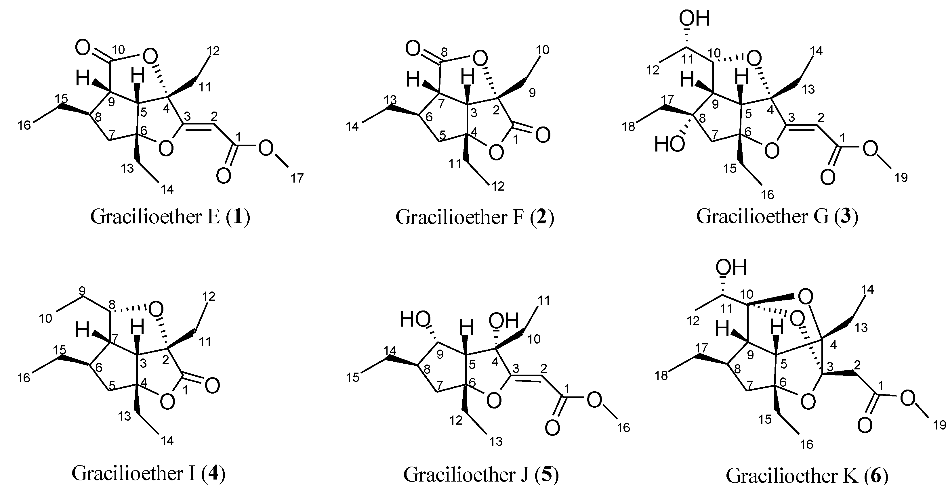 2.1. Isolation of Gracilioethers and Structural Characterization of Gracilioether K (6)