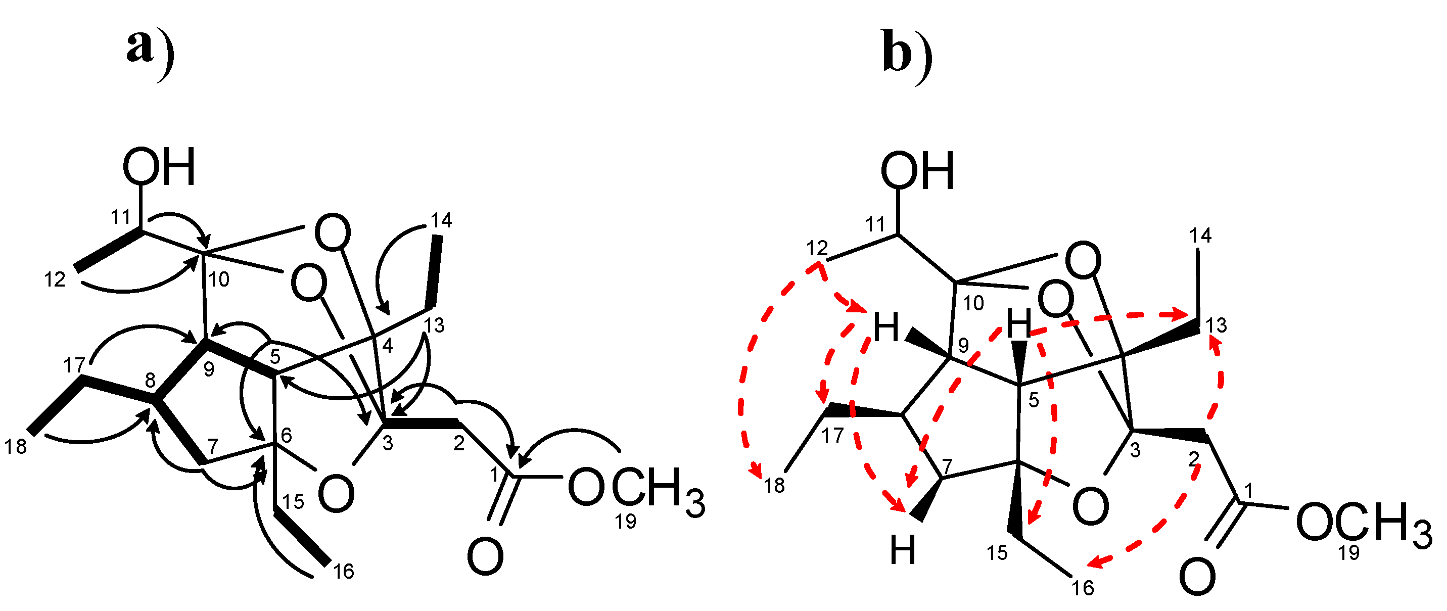 | 7 | 1.51 m 2.28 dd (7.6, 13.8) | 47.9 | C5, C6, C8, C9 | H-5, H-9, H3-16 |