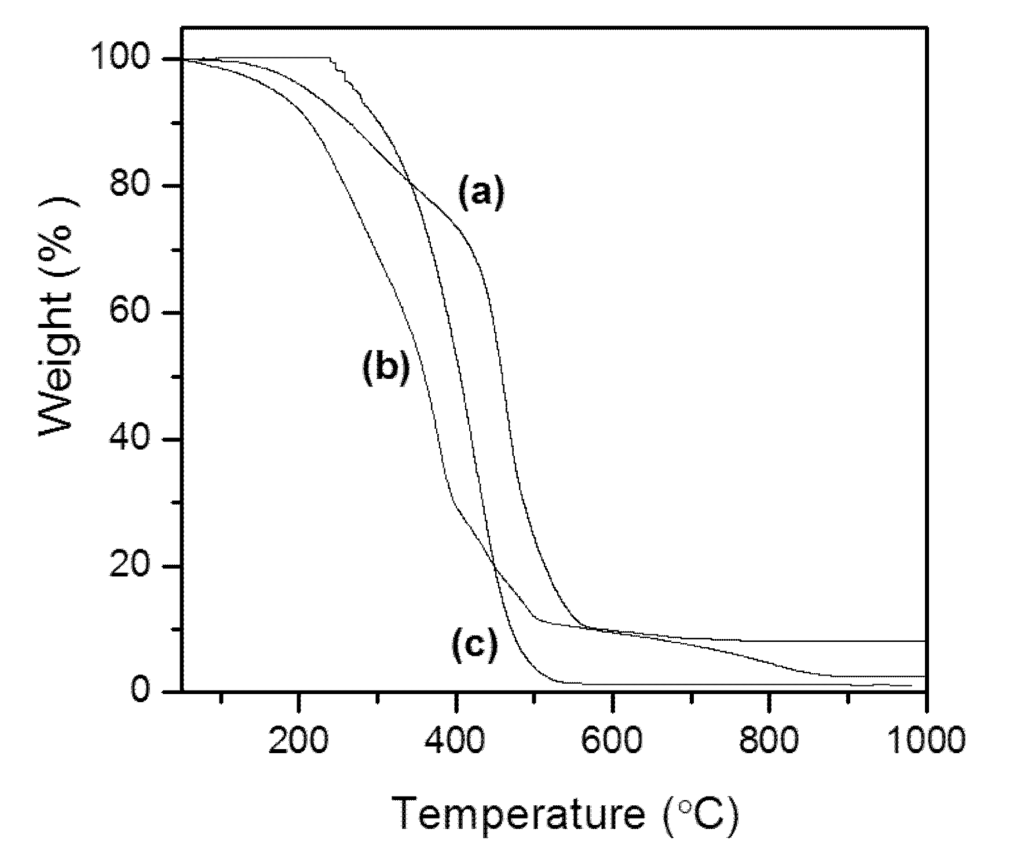 TG curves were recorded using thermal balance (TGA-50 Shimadzu thermogravimetric analyzer, Shimadzu, Kyoto, Japan. A dynamic method was used at a heating rate of 10 °C·min−1. The initial sample mass was 10.00 ± 0.5 mg, in a nitrogen atmosphere with a flow rate of 50 mL·min−1, in a temperature range of 25–1000 °C.