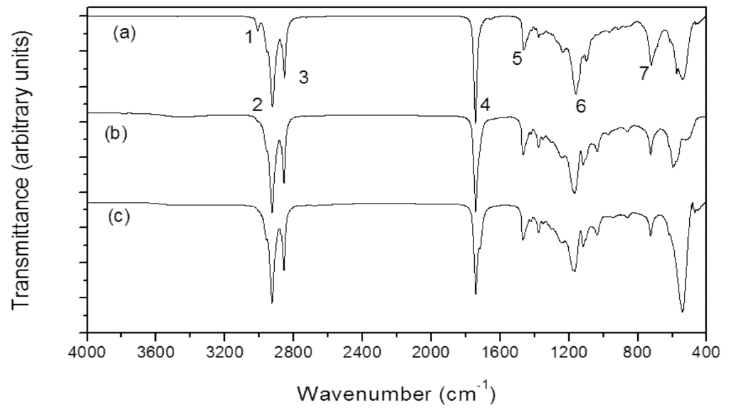 All samples showed a spectrum with vibration band at 3006 cm−1 related to the CH stretching of =C–H bonding (band 1). The two intense bands at 2928 cm−1 (band 2) and 2852 cm−1 (band 3) are due to CH2 asymmetric and symmetric stretching vibrations, respectively. These vibrations were also observed at 2926 and 2855 cm−1 for the spectra of several vegetal oils such as soybean, palm and palm kernel oils [34]. The band at 1744 cm−1 (band 4) is assigned to the C=O stretching vibration of the carboxylic groups, and occurs in the range of 1750–1735 cm−1 [34,35,36]. It appears around the same frequency for methyl esters and triglycerides; for long-chain FAs it appears at around 1700 cm−1.