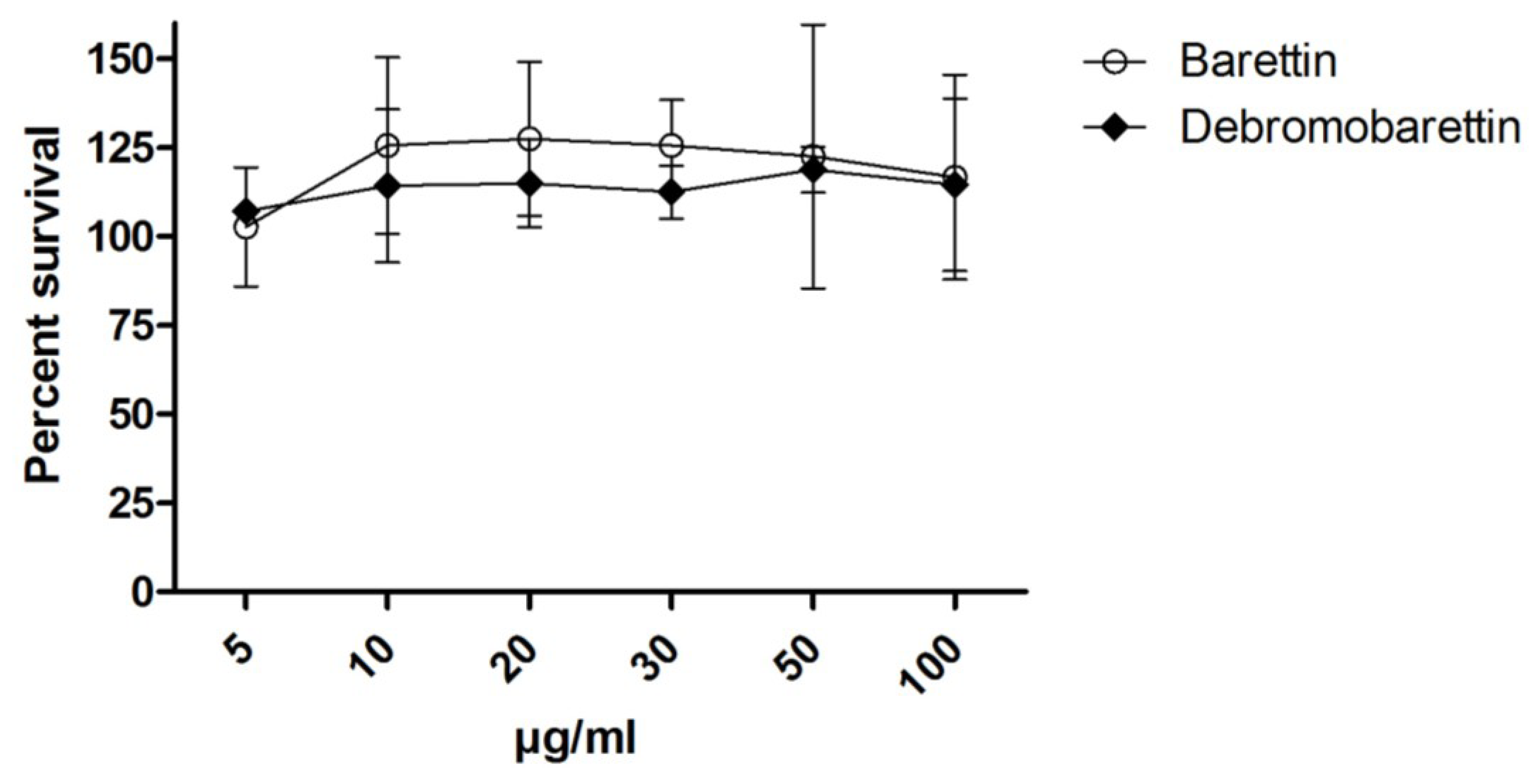 - Johnson, A.-L.; Bergman, J.; Sjögren, M.; Bohlin, L. Synthesis of barettin. Tetrahedon 2004, 60, 961–965. [Google Scholar]