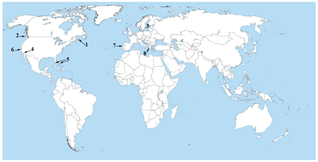 Major appearances of microcystins in the world ocean. (1) Prince Edward Island (Eastern Canadian coast), (2) Gillam Island (Northwestern Pacific coast), (3) Baltic Sea, (4) Salton Sea, (5) Florida Keys and Bahamas, (6) Monterey Bay, (7) Portuguese coast, (8) Amvrakikos Gulf (Mediterranean Sea). For references and details, see the text.