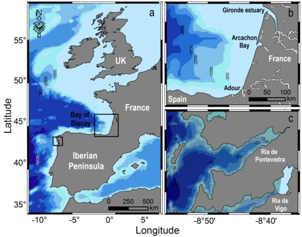 (a) Map of SW Europe showing the two study areas (rectangles); (b) Arcachon Bay and SE Bay of Biscay; (c) Ría de Pontevedra (NW Spain).