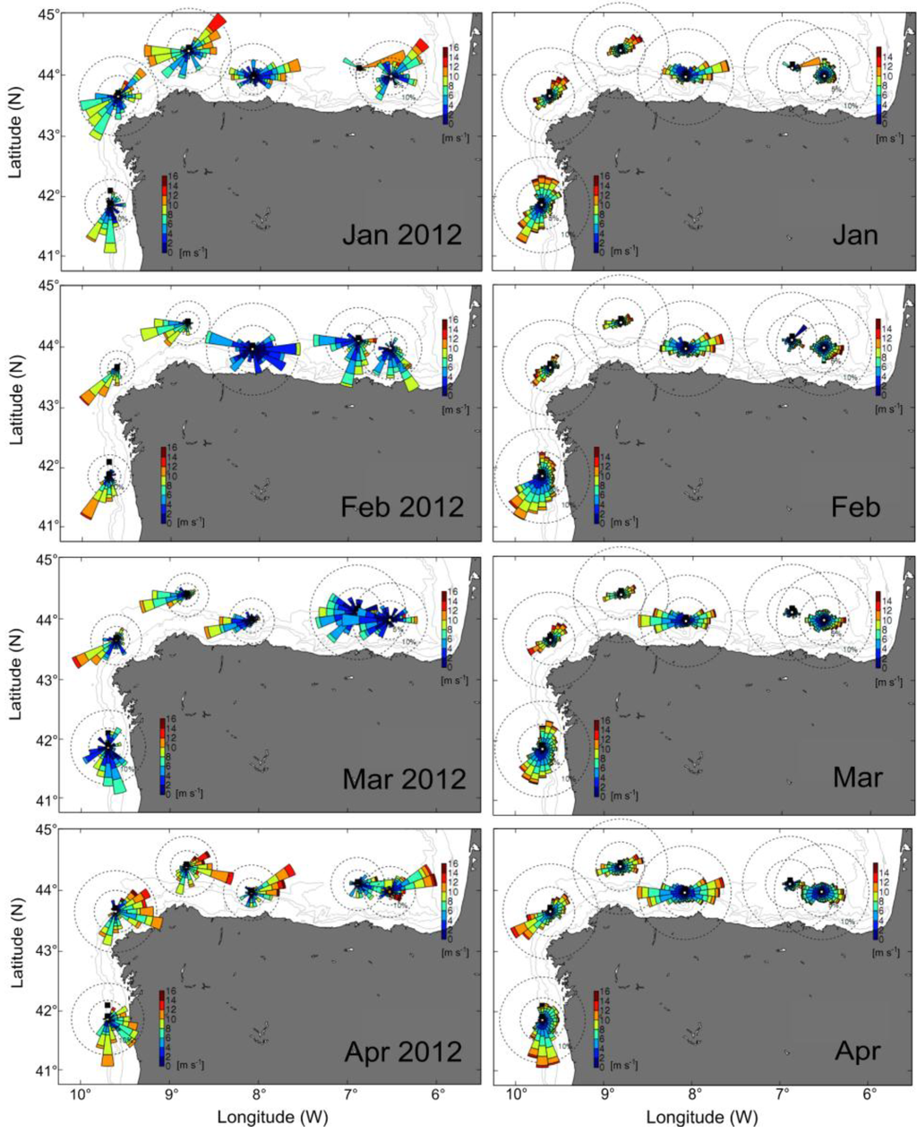 Comparison between wind conditions during winter-spring 2012 (left) and the climatology 1998–2012 (right) on the northwest and north Iberian Peninsula (winds directions are plotted following the oceanographic convention).
