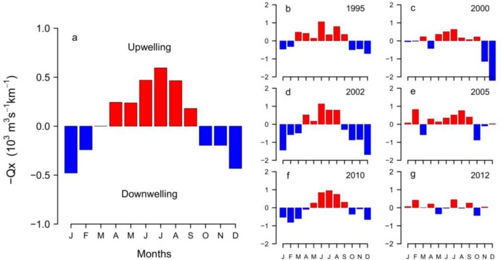 (a) Monthly average (1967–2011) Ekman transport (m3 s−1 km−1) estimated from the FNMOC-model; (b–g) Monthly Ekman transport of selected years with normal (1995, 2002 and 2010) and anomalous (2000, 2005 and 2012) upwelling patterns in relation to the historical monthly average in the Galician Rías Baixas.