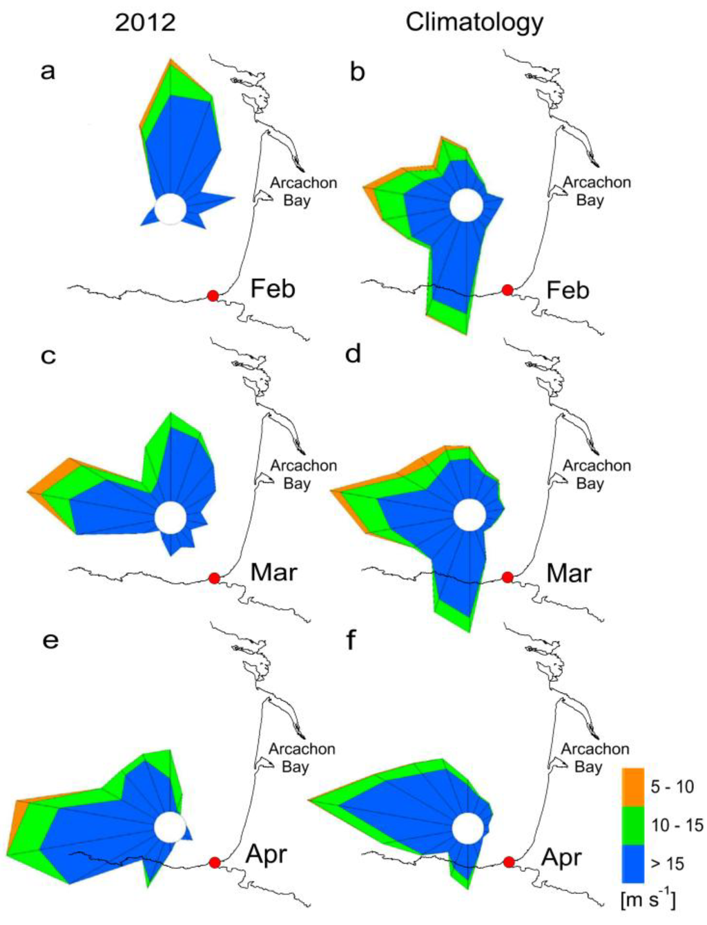 Comparison between wind conditions (a, c, e) during winter-spring 2012 and (b, d, f) the climatology in Arcachon Bay. Location of the Pointe de Socoa Meteorological Station is marked with a red dot (wind directions are plotted following the meteorological convention).