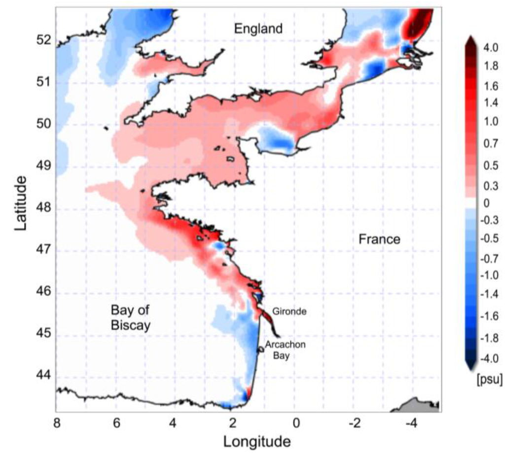 Sea surface salinity (SSS2012–SSSRef) anomalies simulated in February 2012 by the French operational model (MARS-3D, Ifremer) over shelf waters of the eastern Bay of Biscay and the English Channel region. The reference field was estimated from 2010 to 2011.