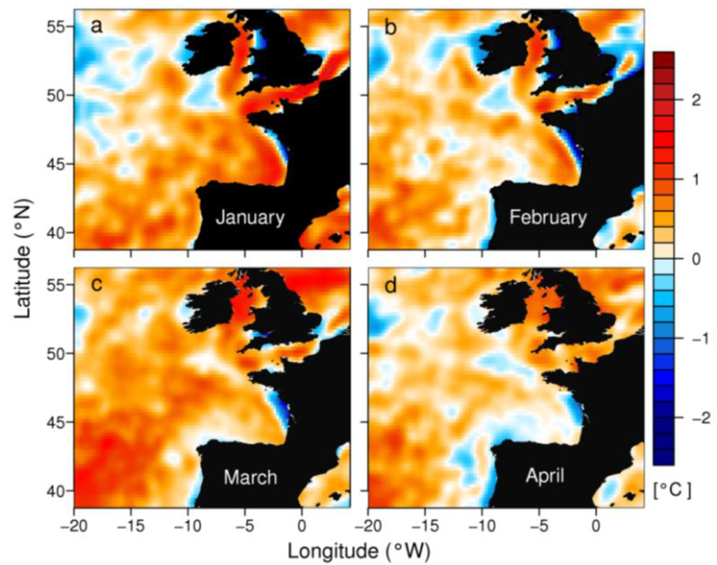 At the mesoscale, positive SST anomalies were observed between the English Channel and western Iberia in winter (Figure 6), but negative anomalies appeared at a smaller scale near the coast due to positive Ekman transport in Galicia and deflected river plumes in the southeast Bay of Biscay.