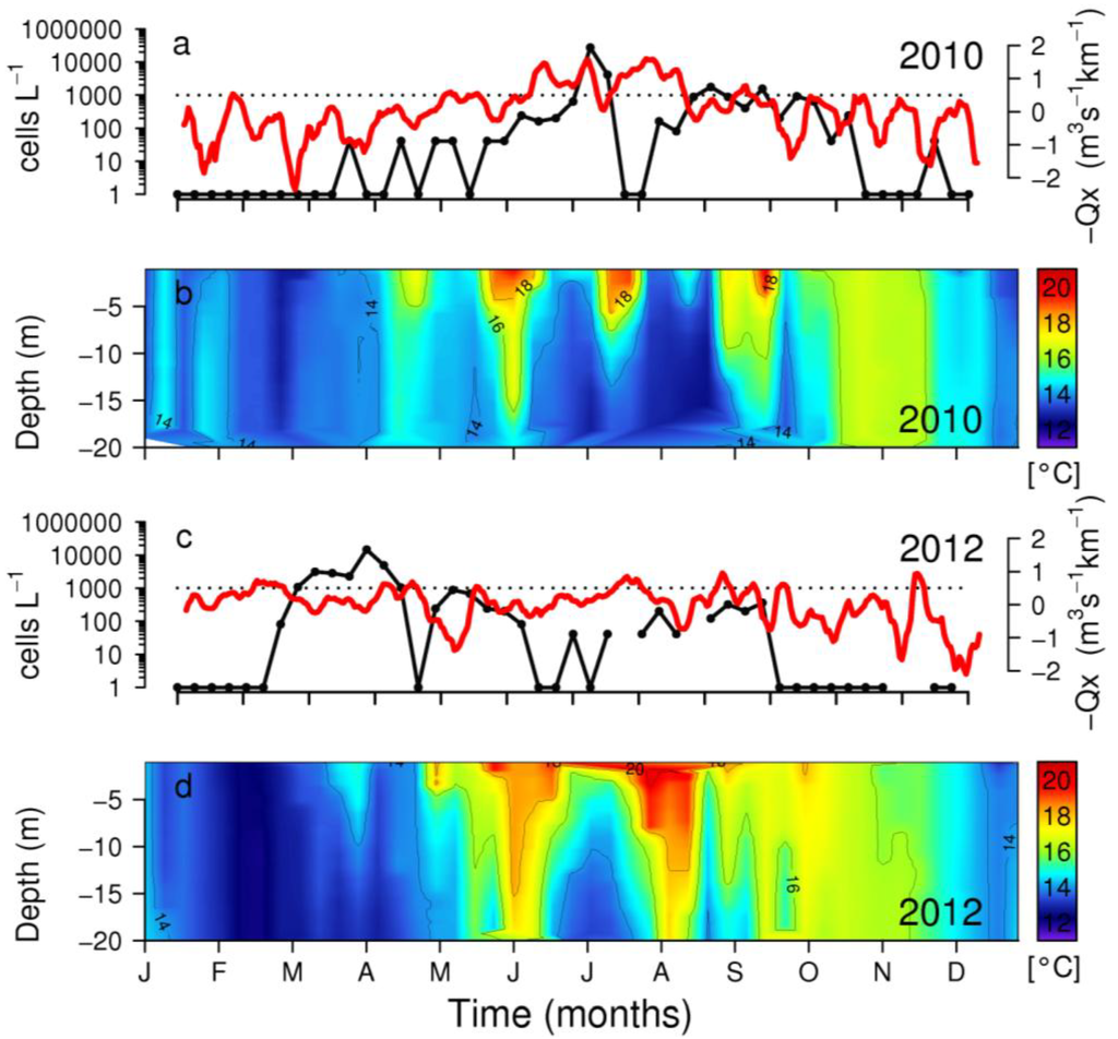 Weekly distribution of D. acuminata (black line), upwelling index (7-day running mean) (red line) and vertical distribution of temperature at station P2 in Ría de Pontevedra during (a,b) years of late (2010) and (c,d) early (2012) initiation of D. acuminata blooms.