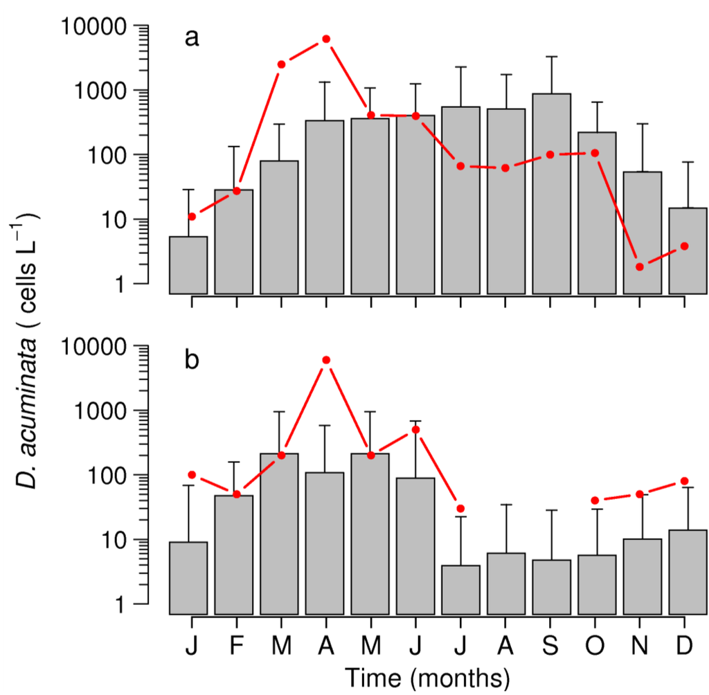 Average cell densities of D. acuminata were used for the time series in the two study areas to smooth variability associated with tidal changes and local wind forcing.