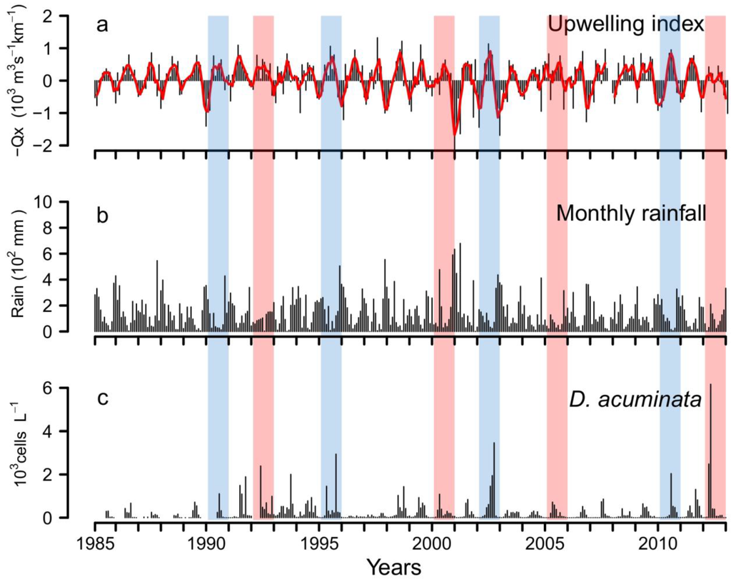 Interannual variability of (a) upwelling index, (b) monthly rainfall in Vigo and (c) monthly average of D. acuminata cells density in Ría de Pontevedra (NW Spain) from 1985 to 2012. Years with normal (blue) and anomalous (red) patterns are highlighted.