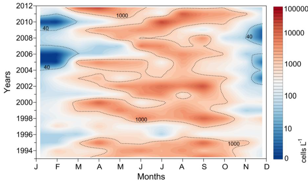 Average cell density of D. acuminata within the Ría de Pontevedra from 1993 to 2012. Dashed-line contours indicate 40 (detection level in the monitoring counts) and 1000 cells L−1 (bloom level). Note that 0 indicates no detection of overwintering cells even in the weekly vertical net-hauls