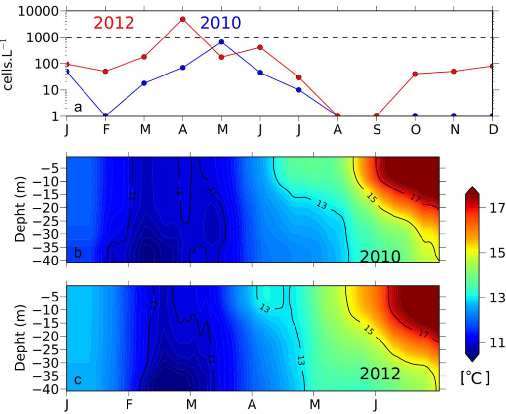 (a) Monthly average of D. acuminata distribution in SW France for 2010 and 2012; (b,c) temporal variation of temperature profiles inferred from MARS 3D simulations at the entrance of Arcachon Bay (1.44°W 44.67°N).
