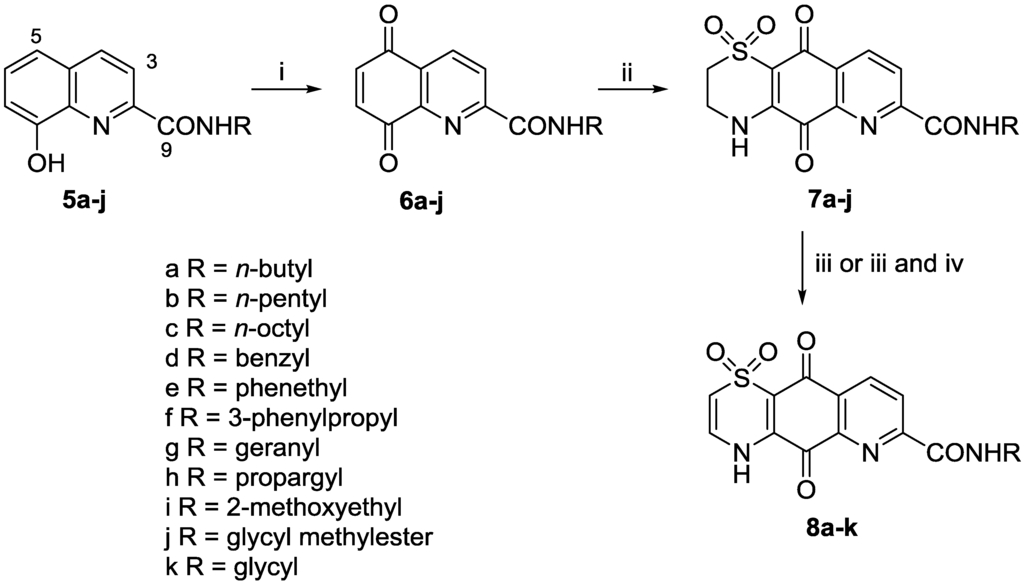 Previous studies by ourselves [16,19] and others [20,21] have found that hypotaurine addition to quinones typically yields a mixture of regio-isomeric thiazine adducts. In the present study, we found that slow addition of a dilute solution of hypotaurine in MeCN/EtOH at room temperature afforded, after filtration and washing, analogues 7a7j in yields of 14%, 27%, 57%, 17%, 49%, 57%, 29%, 29%, 26% and 20%, respectively. The regio-isomeric identity of the product in each case was established by 2D-NMR data, particularly HMBC experiments optimized for 8.3 and 2.0 Hz, which showed correlations from H-9 to quinone C-10 (8.3 Hz) and from NH-4 to quinone C-5 (2.0 Hz) [16]. Reaction of each of 7a7j with 2 N NaOH in DMF for 2 h [16] afforded the desired hydrolysed and autoxidised Δ2(3)-thiazine analogues 8a8i and 8k in variable yield (30%–83%). In the specific case of the glycine methylester 7j the product of this reaction was the Δ2(3)-thiazino carboxylic acid 8k, methylation of which (SOCl2, MeOH, 93% yield) afforded ester 8j.