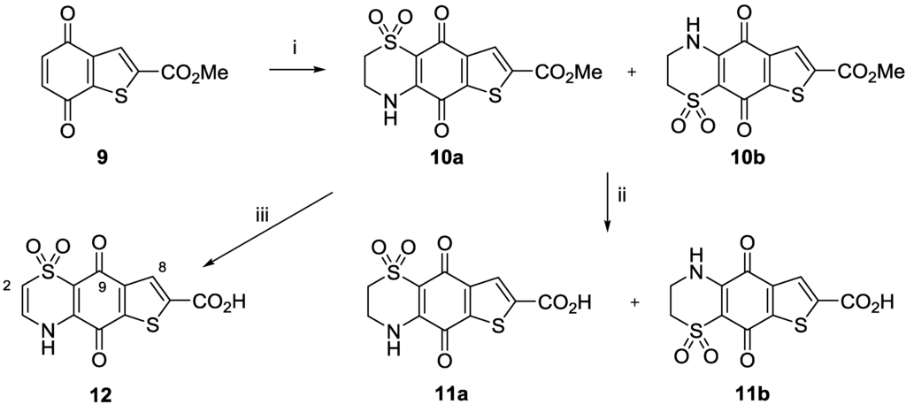 3.2.7. 5,9-Dioxo-3,4,5,9-tetrahydro-2H-thieno[2′,3′:4,5]benzo[1,2-b][1,4]thiazine-7-carboxylic Acid 1,1-Dioxide (11a) and 5,9-Dioxo-2,3,5,9-tetrahydro-1H-thieno[3′,2′:4,5]benzo[1,2-b][1,4] thiazine-7-carboxylic Acid 4,4-Dioxide (11b)