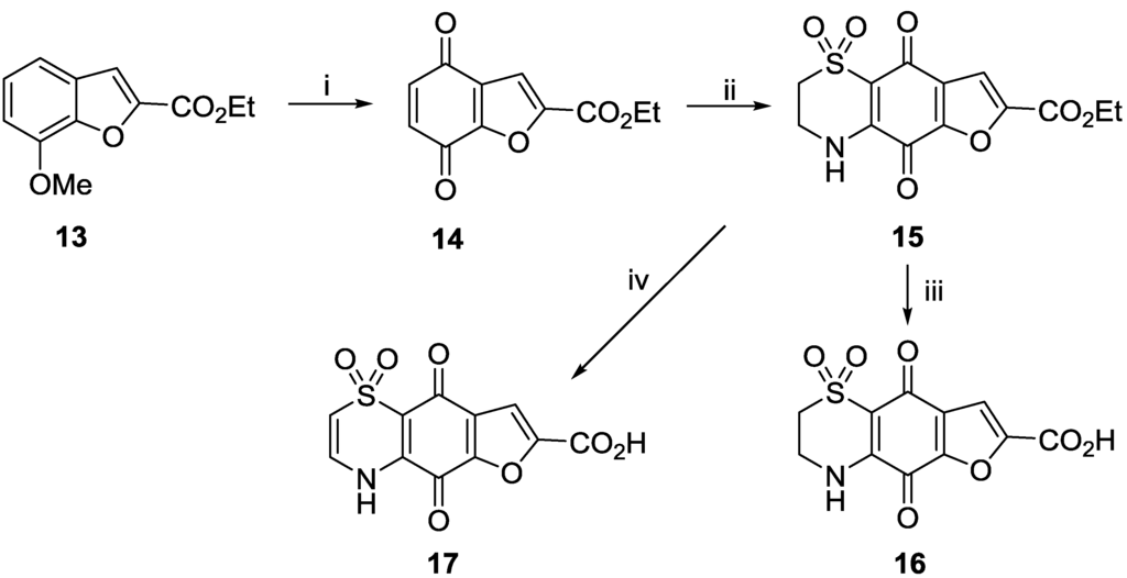 A series of furan analogues were prepared in analogous fashion, this time starting from commercially available 7-methoxy-benzofuran-2-carboxylic acid ethyl ester 13 (Scheme 3). Oxidation using acidified ceric ammonium sulfate afforded quinone 14 in 85% yield. Slow addition of hypotaurine to the quinone afforded a single regio-isomer 15 of the expected dioxothiazine product (43% yield). As demonstrated earlier, acidic hydrolysis of ester 15 yielded the carboxylic acid 16 (63% yield), while biphasic 1N NaOH/EtOAc hydrolysis and autoxidation afforded the Δ2(3) carboxylic acid 17 in 47% yield.
