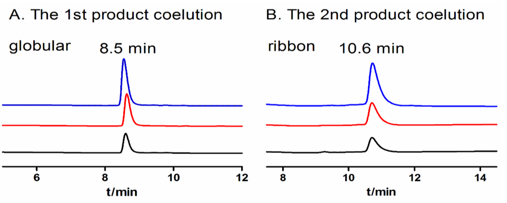 Coelution of “globular” isomer and “ribbon” isomer from one-step oxidation and two-step oxidation, respectively. (A) The first product of one-step oxidation and the native “globular” isomer of two-step oxidation were co-eluted in a 1:2 ratio and analyzed by HPLC. (B) The second product of one-step oxidation and the “ribbon” isomer of two-step oxidation were co-eluted in a 1:2 ratio and analyzed by HPLC. The retention time with 8.5 min of “globular” isomer (A) and 10.6 min of “ribbon” isomer (B) was the same for one-step oxidation (black), two-step oxidation (red) and the co-eluted peptides (blue) respectively.