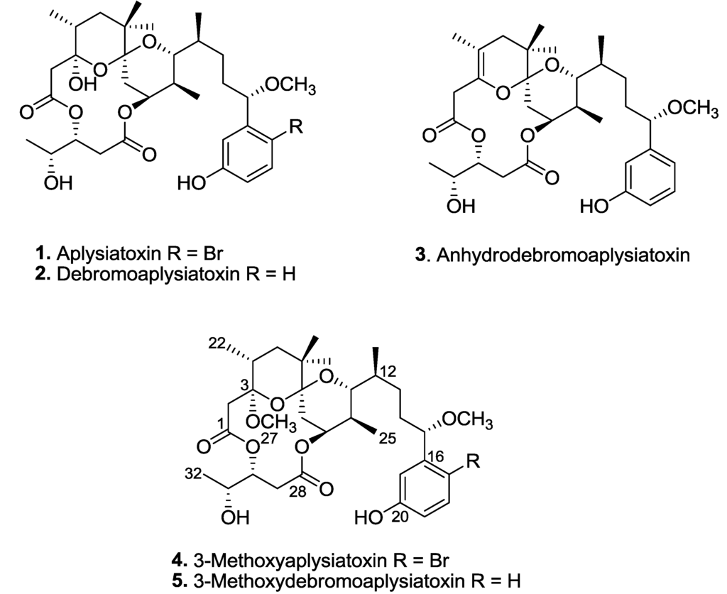 | 3-Methoxyaplysiatoxin (4) | 3-Methoxydebromoaplysiatoxin (5) | ||||