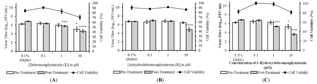 Dose-dependent studies of antiviral activities of (A) debromoaplysiatoxin (2); (B) anhydrodebromoaplysiatoxin (3); and (C) 3-methoxydebromoaplysiatoxin (5). SJCRH30 cells were treated with marine toxins either before (pre-treatment) or after (post-treatment) infection with CHIKV. Cell culture supernatants were harvested at 24 hpi (h postinfection) for titration via plaque assays. All compounds displayed statistically significant dose-dependent inhibition of CHIKV titres upon post-treatment and minimal cytotoxicity was observed upon treatment of SJCRH30 cells with marine compounds for 24 h. Statistical significance was analyzed by one-way ANOVA and Dunnett’s post-test (*, p ≤ 0.05; ***, p < 0.001; ****, p < 0.0001). (Error bars for dose-dependent and cell viability studies represent standard errors of means from three independent and from at least two independent experiments, respectively.)