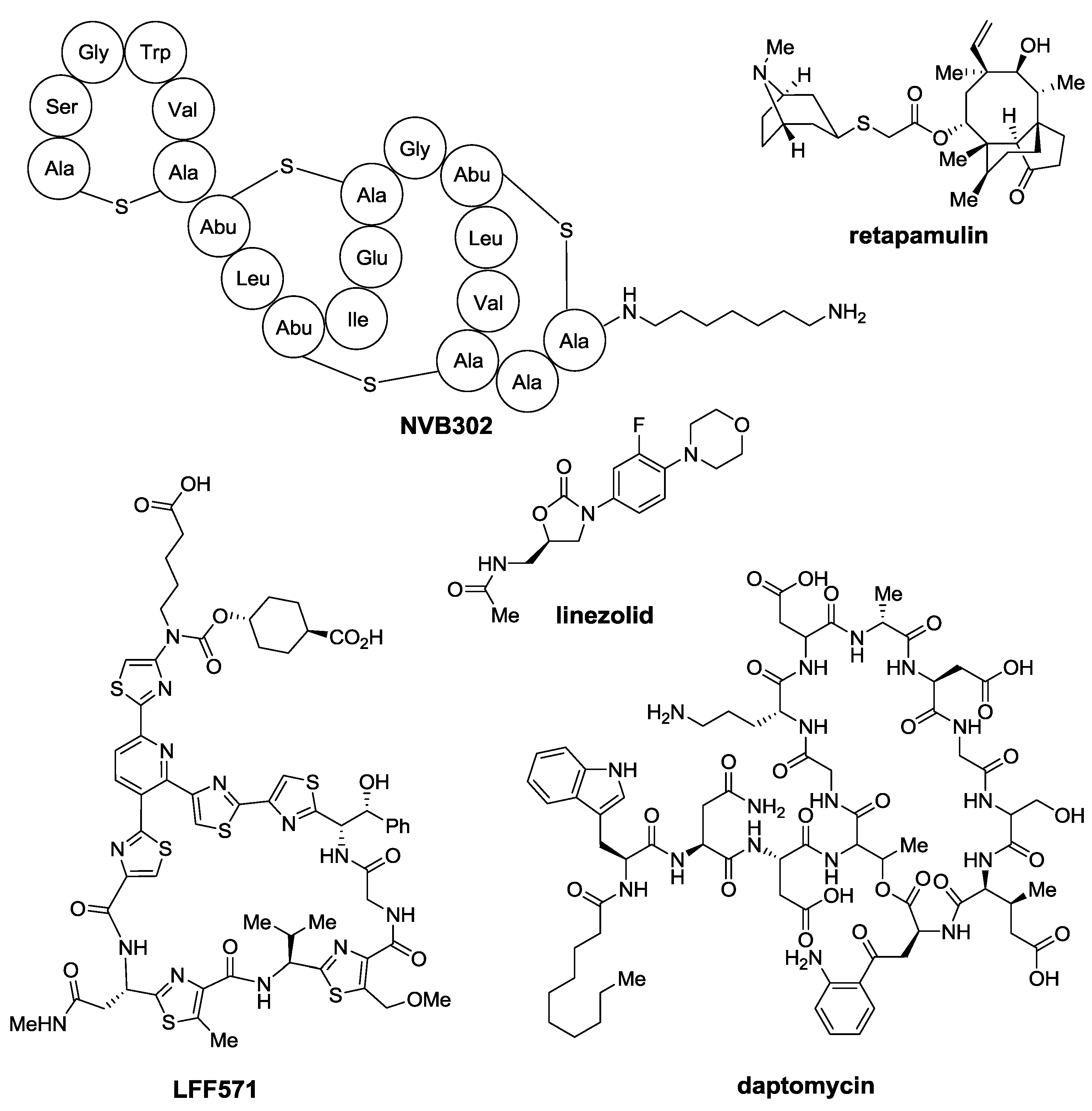 Most of the antibacterial scaffolds known to date were discovered from late 1930s to early 1960s. After that period, almost forty years followed without new bactericide architectures appearing in the market. During those years, semi-synthetic modifications of the already known compounds were used to fight antibacterial resistance. However, with the new century, a batch of new antibiotic scaffolds got closer to the clinic (Figure 1). These include oxazolidinones (linezolid, 2000), lipopeptides (daptomycin, 2003) and mutilins (retapamulin, 2007). In parallel, other types of antibiotics, such as lantibiotics [3] (NVB302) and thiopeptides [4] (LFF571) [5], are under study and some members of these groups are already in clinical trials for the treatment of human infections.