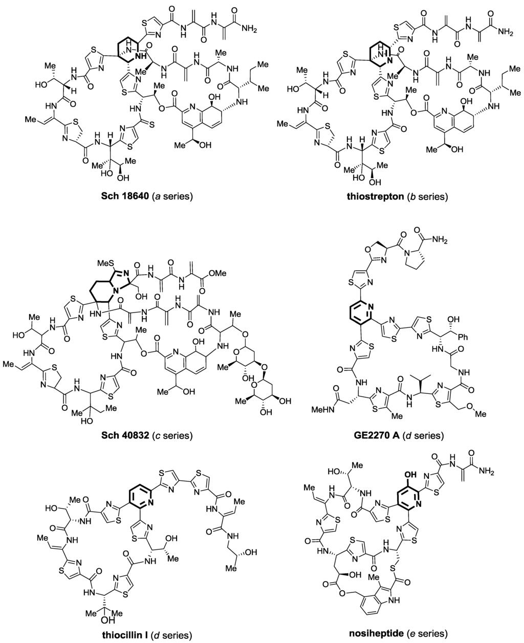 Classification of thiopeptide antibiotics into different series. Their characteristic central six-member ring is highlighted in bold.