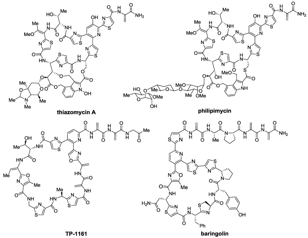 Thiopeptides have been isolated from diverse sources. In 1948, the first known member of the family, micrococcin [6], was isolated from a sample of Oxford’s sewage waters. Accounting for the highly diverse origin of thiopeptides, micrococcin P1 was more recently isolated from a completely different source, a French cheese [7]. However, more conventional samples, such as from soil are the main source of most thiopeptides. In fact, thiostrepton, the most famous member of the family, has been isolated from different soil samples [8,9,10], including one from Hawaii in 1955 [11], shortly after it was first discovered in 1954 [8,9,10]. Although a few more thiopeptides were isolated during the following years, it was from the 1980s, especially during the 1990s, that most of the known members were discovered. Nonetheless, many novel entities have also been described during the last decade. Remarkably, the first thiopeptide antibiotics isolated from a marine source were YM-266183 and YM-266184, discovered as late as 2003, in Japan [12]. During the last few years some more thiopeptides have been isolated and characterized; these include the thiazomycins (2007) [13,14,15,16], philipimycin (2008) [17], thiomuracins (2009) [18], TP-1161 (2010) [19,20], baringolin (2012) [21], and kocurin (2013) [22] (Figure 3).
