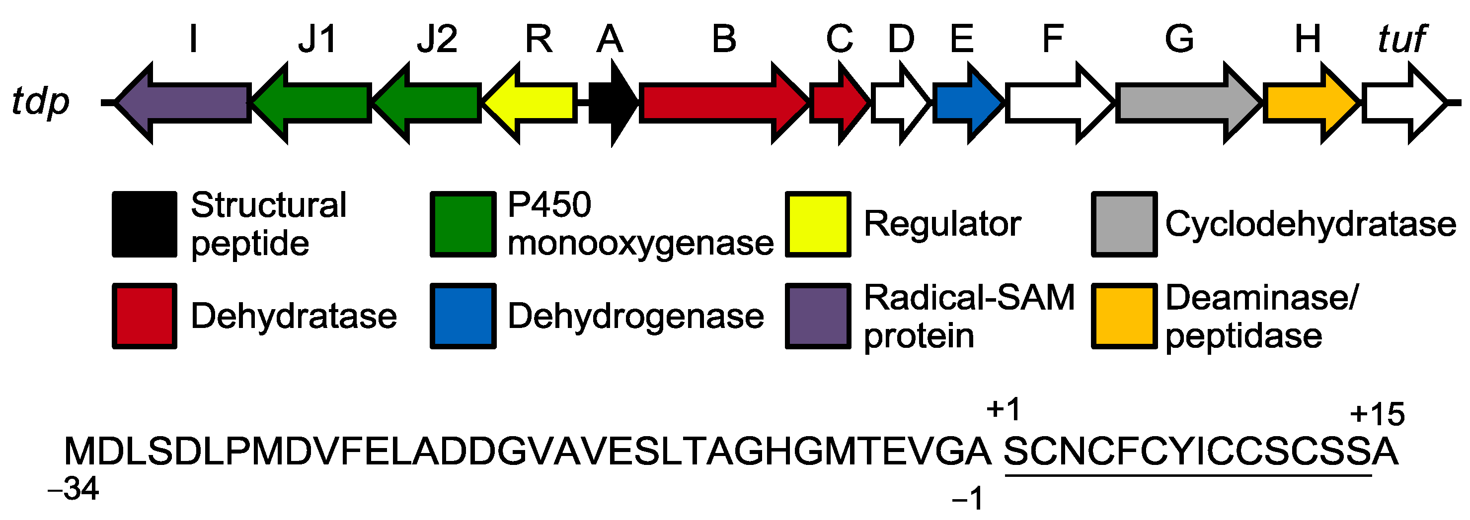 Joint efforts of bio-informatics and genome mining have been essential for the identification of genes that encode the precursor peptide and the enzymatic machinery necessary for its subsequent tailoring [18,20,50,51,52,53,54,55,56,57,58,59]. The gene encoding the precursor peptide has been identified for many thiopeptides and, in all cases, there is a perfect agreement with the expected amino acid sequence. This precursor peptide is divided in two different regions, a structural peptide of 12 to 17 residues at the C-terminus, which contains the amino acids that will constitute the thiopeptide itself, and a leading peptide of 34 to 55 residues at the N-terminus, which is cleaved during the bio-synthetic process. In some cases, the C-terminal structural peptide contains one or two extra residues that are cleaved during the tailoring to confer each thiopeptide its characteristic C-terminus [60,61]. All necessary enzymes for pre-peptide tailoring are encoded in genes surrounding that of the precursor peptide, forming a gene cluster (see Figure 4 for an example on thiomuracins’ gene cluster (tdp) and precursor peptide [18]; in the gene cluster, genes appear as arrows and are named with letters. Each gene (tdpX) codes a gene product, a protein/enzyme (TdpX)).