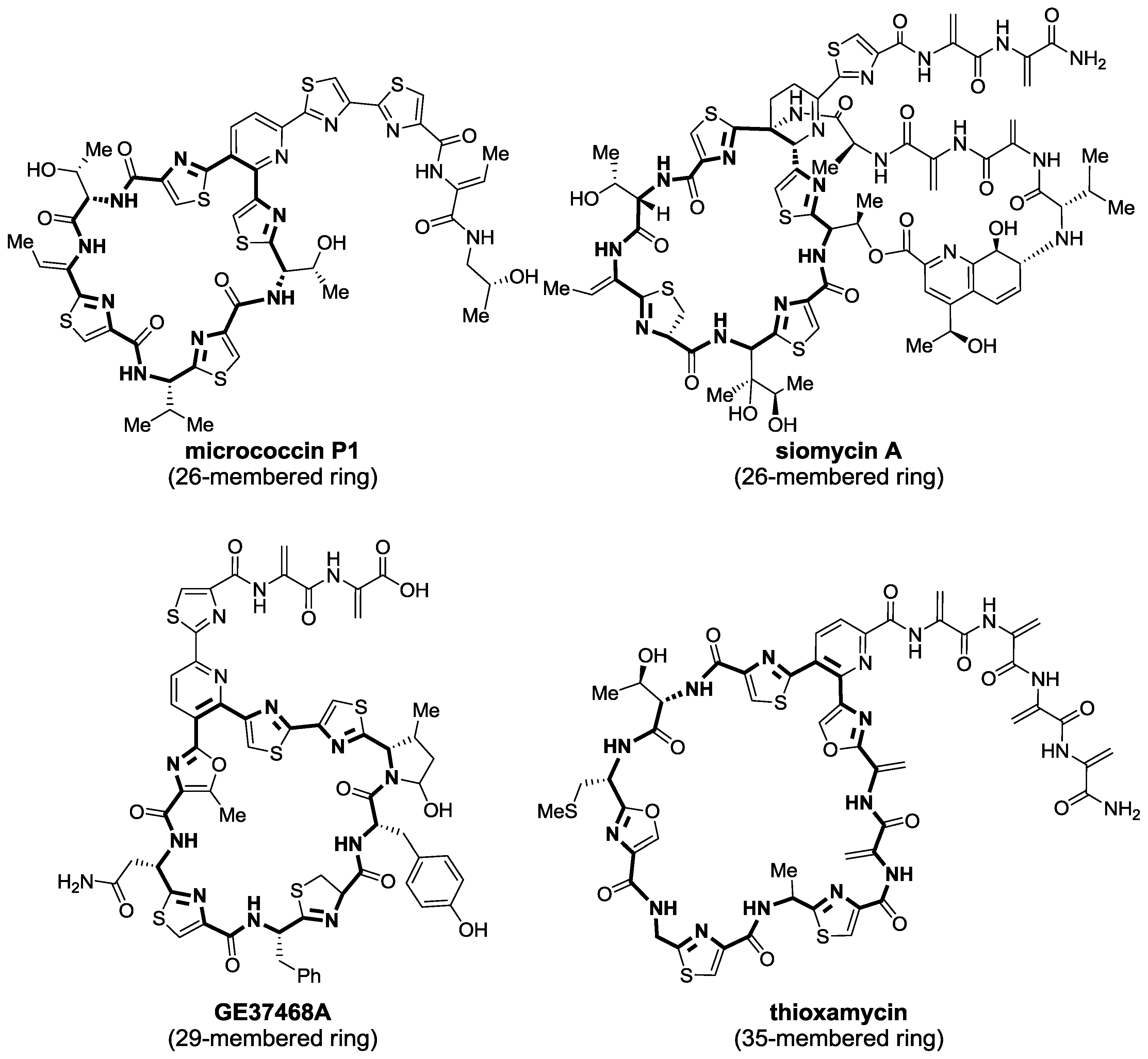It is already well established that thiopeptides exert their antibacterial function via the inhibition of ribosomal protein synthesis. However, this is the result of different mechanisms of action that depend on macrocycle size. Thiopeptides exhibit macrocycles of three different sizes, 26-, 29-, and 35-membered rings, depending on the number of residues present. On one hand, thiopeptides of 26-member macrocycles, such as that of micrococcin P1 and the siomycins (Figure 5), are known to bind the GTPase-associated region of the ribosome/L11 protein complex. By doing so, the thiopeptide blocks the binding region of elongation factor G (EF-G) and does not allow translocation of the growing-peptide/tRNA complex in the ribosome to occur [93,94,95]. On the other hand, those thiopeptides with a 29-membered ring, in the fashion of GE37468A, bind to elongation factor Tu (EF-Tu), blocking its tRNA/amino acyl complex binding site [96,97,98]. As a consequence, the complex cannot be delivered into the ribosome and peptide elongation does not take place. Compounds with the largest macrocycles, those with 35-membered rings, maintain potent antibacterial activity; however, their molecular target still remains unknown.