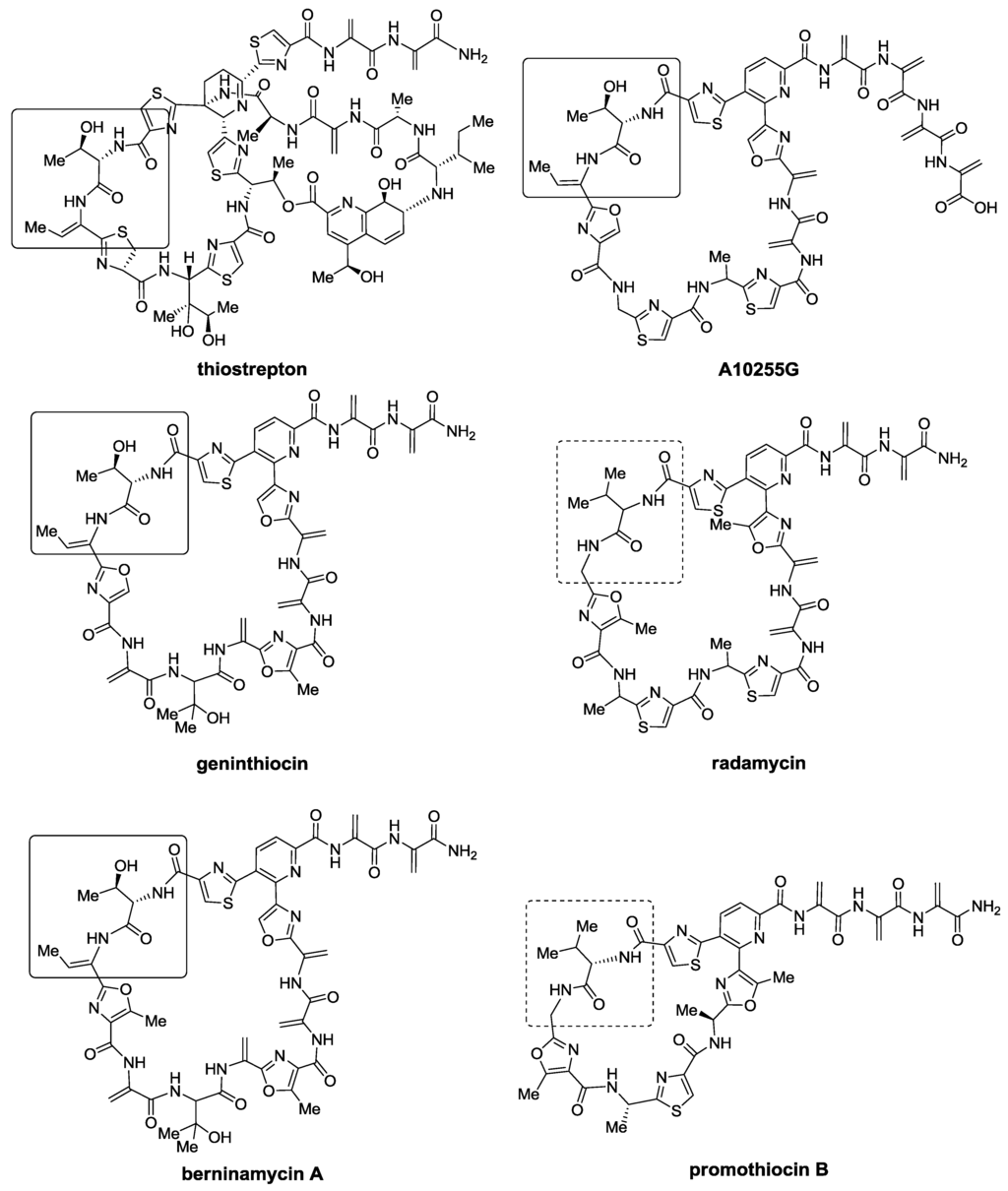 Thiopeptides with tipA promoting activity. A very preserved region, which has been shown to interact with the ribosome/L11 complex, is highlighted (solid squares). Radamycin, devoid of antibacterial activity, has a mutated sequence in the previously mentioned region (hashed squares). Promothiocin B possesses the same mutated residues, but maintains antibacterial activity, though in a 26-membered macrocycle.