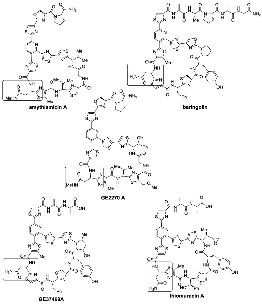 Thiopeptides known or presumed to bind to EF-Tu, those with 29-membered macrocycles, also possess a very preserved residue in their macrocycle, pointing to a key interaction required to exert their biological activity. The amythiamicins, baringolin, the GE2270 series, GE37468 A, and the thiomuracins, all belonging to the d series, preserve an Asn residue in the same position that is either methylated or not (Figure 7). Codon randomization experiments by Walsh et al. [104] produced various GE37468 A analogs that substituted Asn with Ala, Cys, His, and Ser; however, none of these analogs retained antibacterial activity, supporting the key role of this residue. Apart from providing a key contact with EF-Tu, the Asn residue participates in the stabilization of the bioactive conformation of the macrocycle, providing a transannular H-bond [105].