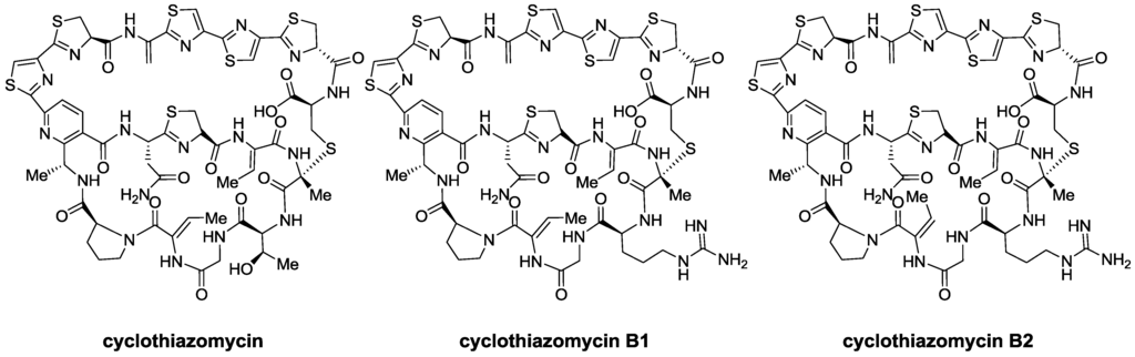 Thiopeptides with a very similar structure to cyclothioazomycin were recently isolated and characterized and were named after the parent compound (Figure 8) [91]. In particular, cyclothiazomycin B1 was found to inhibit transcription by bacteriophage RNA polymerase. Such result might serve to further understand transcription at the molecular level.