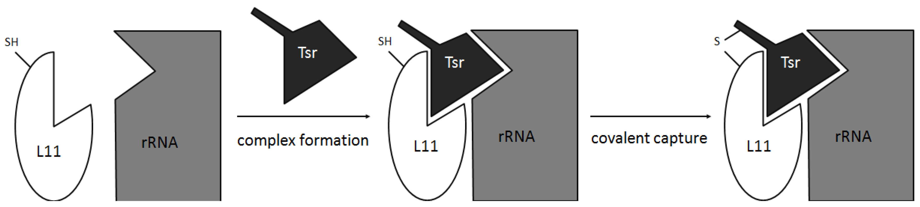 Proximity induced covalent capture. Mutated L11 protein has an external Cys residue in the area where interaction with the tail of thiostrepton is expected. Tsr = thiostrepton.