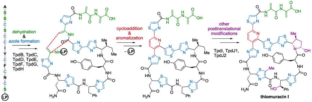 Biosynthetic pathway of thiomuracin I. LP = leading peptide. Enzymes involved in the biosynthetic pathway (TdpX) are named according to their corresponding gene (tdpX) in thiomuracins’ gene cluster (tdp).