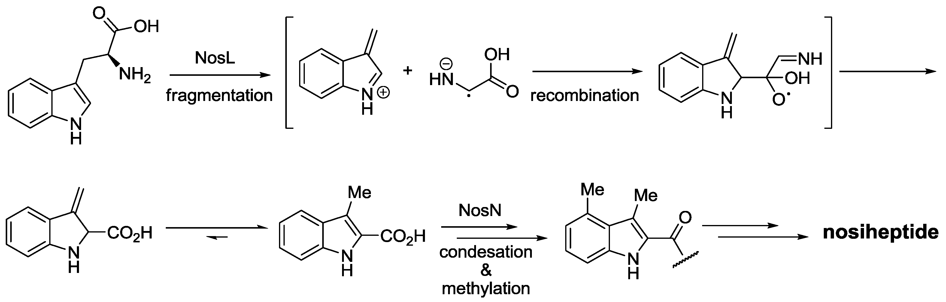 In the case of indolic acid formation, Trp undergoes a radical-mediated rearrangement and Cα migrates to position 2 of indole (Scheme 2). Subsequently, S-adenosylmethionine-dependent 4-methylation of the aromatic scaffold after condensation with the structural peptide yields an advanced intermediate of the mature thiopeptide [65,75].