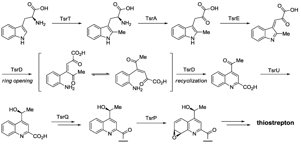 Both quinaldic and indolic acid moieties found in a–c and e series thiopeptides are synthesized from l-Trp and are part of the second macrocycle found in these compounds. This was first demonstrated by labeling [69,70,71,72] and enzyme function [73,74] experiments and, more recently, also using genetic engineering methods [63,65,66,67].
