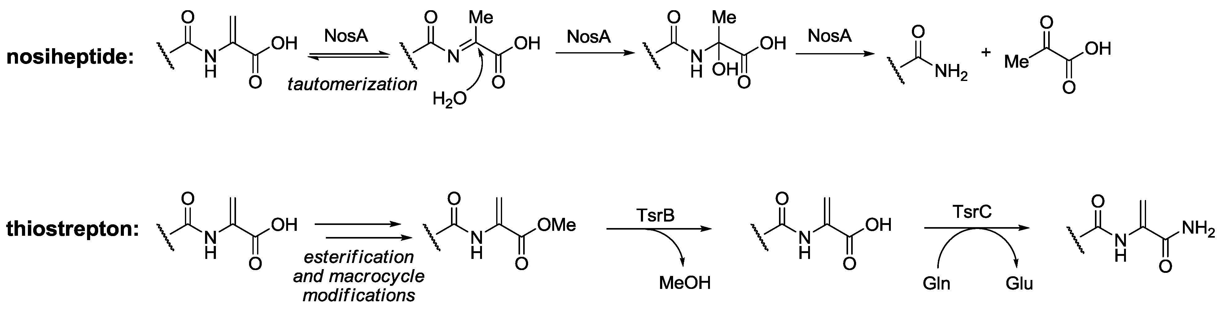 C-terminal tailoring is one of the last steps in thiopeptides maturation. In those cases where a C-terminal amide is present, two distinct mechanisms have been described for its formation (Scheme 4). Nosiheptide structural peptide contains an extra C-terminal Ser residue, which is lost during tail maturation, giving rise to a C-terminal amide [60]. By contrast, structural peptide of thiostrepton does not contain any extra amino acids and its C-terminal Ser residue can be methylated to form the corresponding ester (Scheme 4). The C-terminal amide is formed by deesterification and subsequent amidation using Gln as nitrogen donor [61].