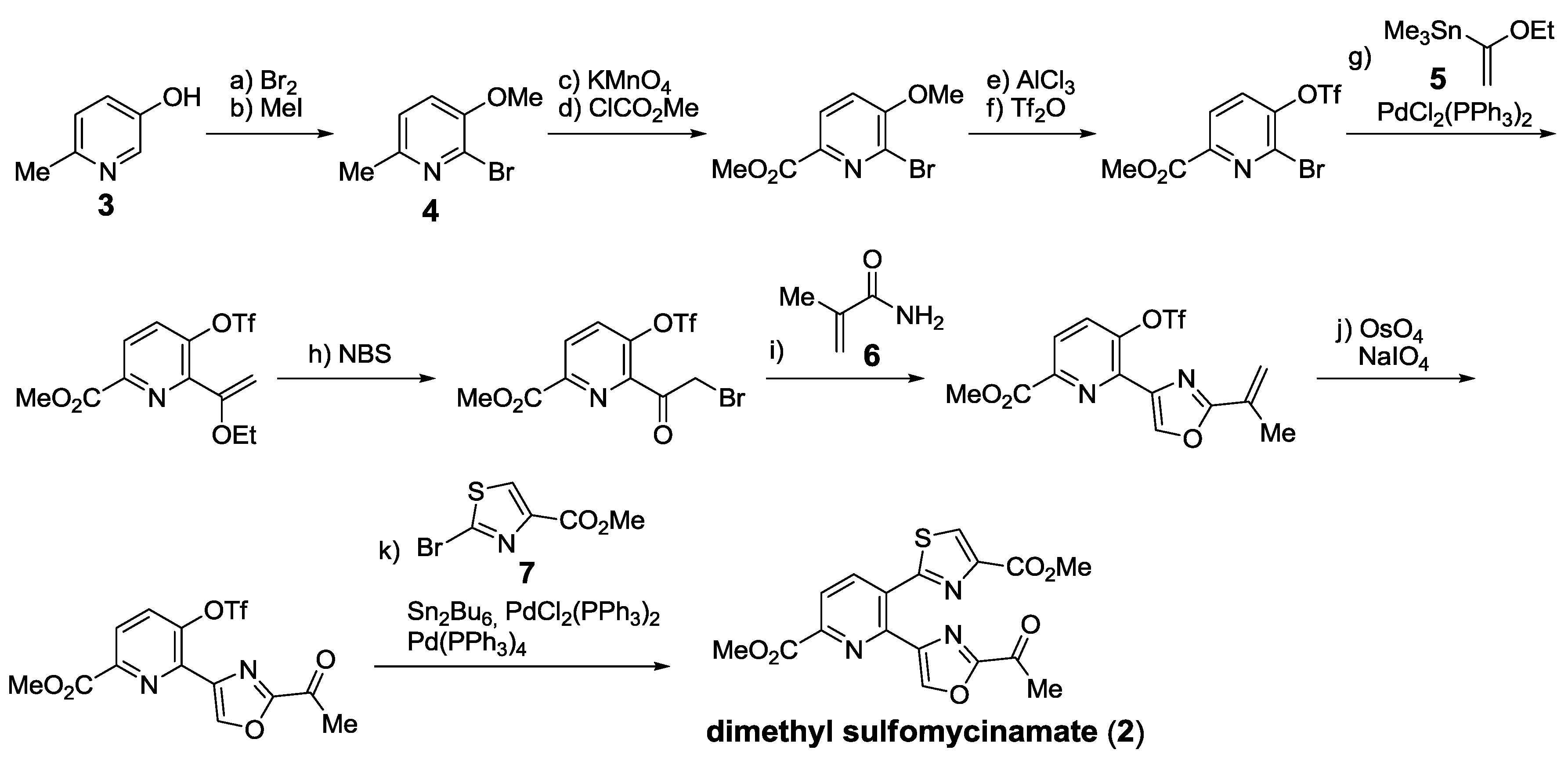 Kelly’s synthesis of dimethyl sulfomycinamate. Reagents and conditions: (a) Br2, pyridine, rt, 77%; (b) MeI, K2CO3, acetone, reflux, overnight 88%; (c) KMnO4, 90 °C, 3 h; (d) ClCO2Me, Et3N, DMAP, CH2Cl2, 0 °C to rt, 2 h, 65%; (e) AlCl3, CH2Cl2, reflux, 2 days, 93%; (f) Tf2O, 2,6-lutidine, CH2Cl2, 0 °C, 5 min, 95%; (g) 5, PdCl2(PPh3)2, 1,4-dioxane, 100 °C, overnight 97%; (h) NBS, THF, H2O, rt, 10 min, 95%; (i) 6, THF sealed tube, 100 °C, 3 days, 65%; (j) OsO4, NaIO4, 1,4-dioxane, H2O, rt 3 h, 85%; (k) 7, Sn2Bu6, PdCl2(PPh3)2, Pd(PPh3)4, LiCl, 1,4-dioxane, 100 °C, overnight, 35%.