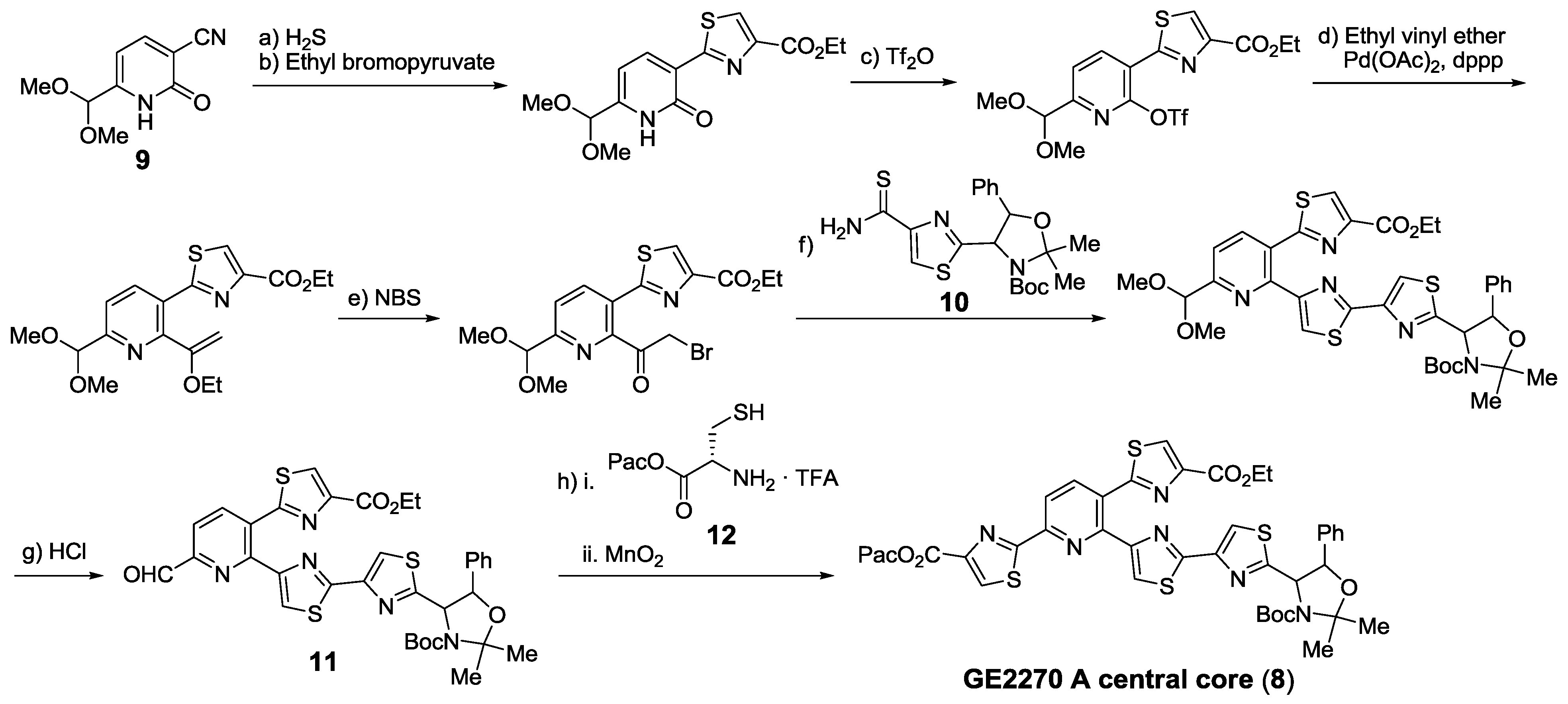 Shin and co-workers developed their own strategies and synthesized many polyheterocyclic cores and fragments, such as GE2270 A central core (8) [140,141,142,143,144,145,146,147]. Most of their syntheses start from a pre-functionalized pyridine or pyridone of the like of 9 (Scheme 6). For the synthesis of 8, thiazoles were constructed using different methods, including Hantzsch syntheses with ethyl bromopyruvate and thioamide 10, followed by condensation of aldehyde 11 with Cys 12 and subsequent oxidation with activated manganese (II) oxide.