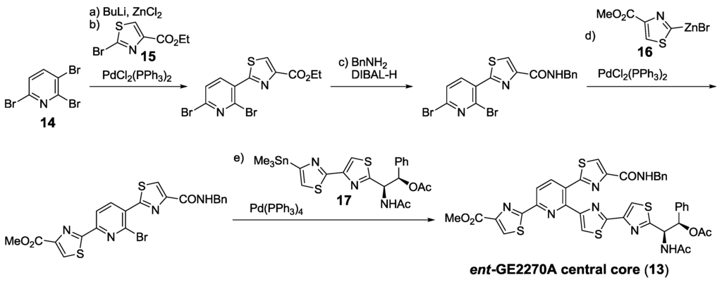 Bach’s group described a very convergent approach to the enantiomer of GE2270 A core (13), which started from 2,3,6-tribromopyridine (14), and was fully based on sequential cross-coupling reactions with thiazoles 15−17 [135] (Scheme 7). This work served for confirmation of the polyheterocyclic core stereochemistry and also set the methodology for further syntheses of GE2270A [129] and amythiamicins A and D [148].
