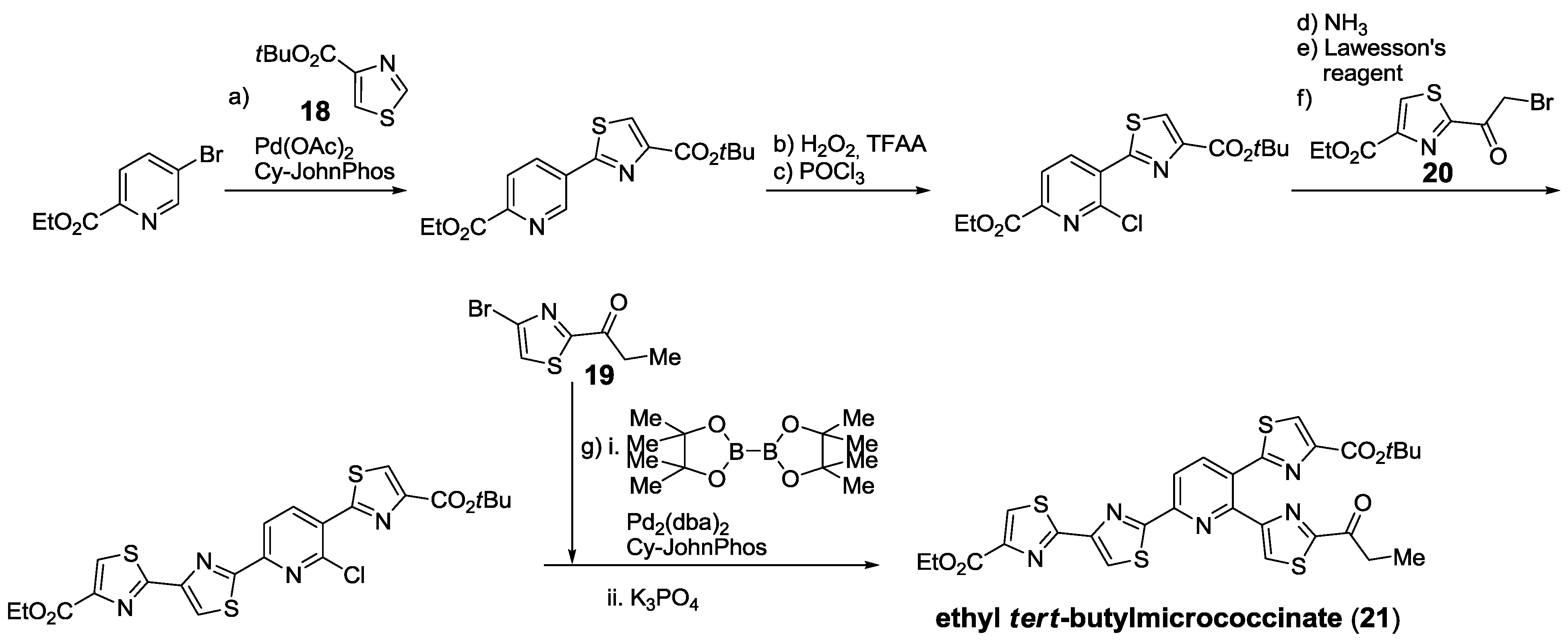 - Moody, C.J.; Bagley, M.C. Studies on thiopeptide antibiotics: synthesis of an oxazole-thiazole-pyridine fragment related to promothiocin A. Synlett 1998, 1998, 361–362. [Google Scholar] [CrossRef]