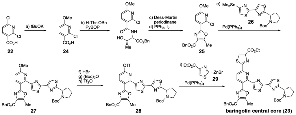 Synthesis of baringolin’s central polyheterocyclic core. Reagents and conditions: (a) tBuOK, MeOH, 65 °C, 4 days, 85%; (b) H-Thr-OBn, pyBOP, DIPEA, THF, 0 °C, 3 h, 89%; (c) Dess-Martin periodinane, CH2Cl2, rt, 6 h, 95%; (d) PPh3, I2, NEt3, CH2Cl2, 0 °C to rt, 15 h, 78%; (e) 26, Pd(PPh3)4, 1,4-dioxane, 80 °C, 48 h, 88%; (f) HBr, AcOH, rt, 28 h, 73%; (g) (Boc)2O, NEt3, CH2Cl2, 0 °C, 4 h, 94%; (h) Tf2O, 2,6-lutidine, DMAP, CH2Cl2, 0 °C to rt, 3 h, 88%; (i) 29, Pd(PPh3)4, DMA, 45 °C, 1 h, quant.