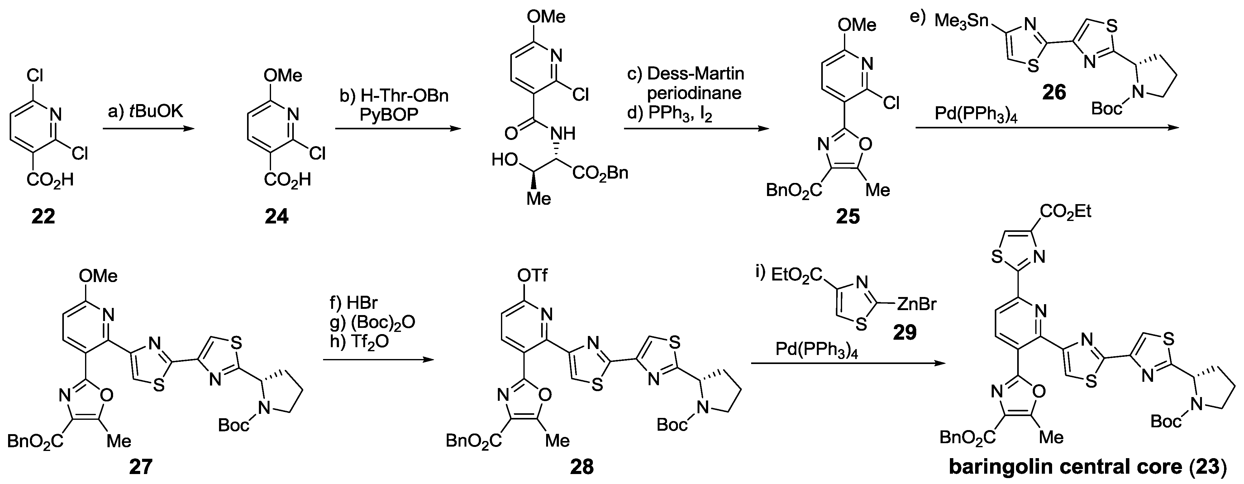 The last example of cross-coupling-based construction of thiopeptide polyheterocyclic cores was reported by Álvarez’s group [149] and used the regioselective differentiation of the two α positions in 2,6-dichloronicotinic acid (22) [150]. This strategy gave access to baringolin’s central core (23), facilitating its total synthesis [151] (Scheme 9). The carboxylic acid present in 24 was used to construct oxazole 25 and subsequent Stille cross-coupling with 26 [152] provided methoxypyridine 27. After conversion of 27 to the corresponding triflate 28, Negishi cross-coupling with 29 yielded 23.