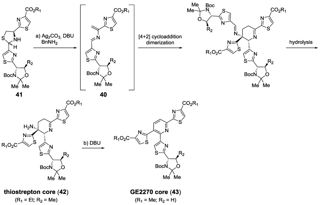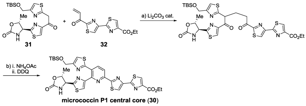 One of the most appealing contributions and the first one to rely on construction of the pyridine ring was Ciufolini’s synthesis of micrococcin’s central polyheterocylic core (30) [131] (Scheme 10). With the required thiazole building blocks, 31 and 32, in hand, the pyridine ring is formed in two steps in almost quantitative yield. This led to the synthesis of the Bycroft-Gowland structure of micrococcin P1, which had been miss-assigned [36]. It took ten more years to finally synthesize the true structure of micrococcin P1 and confirm its stereochemistry [37]. Using the same strategy, thiocillin I has been recently synthesized [153].
